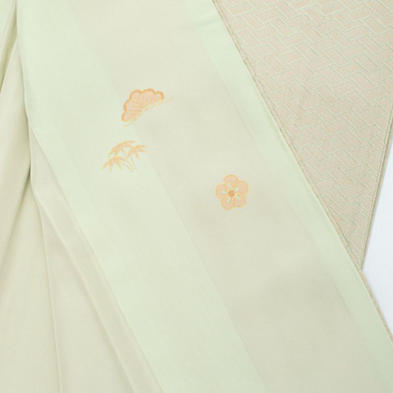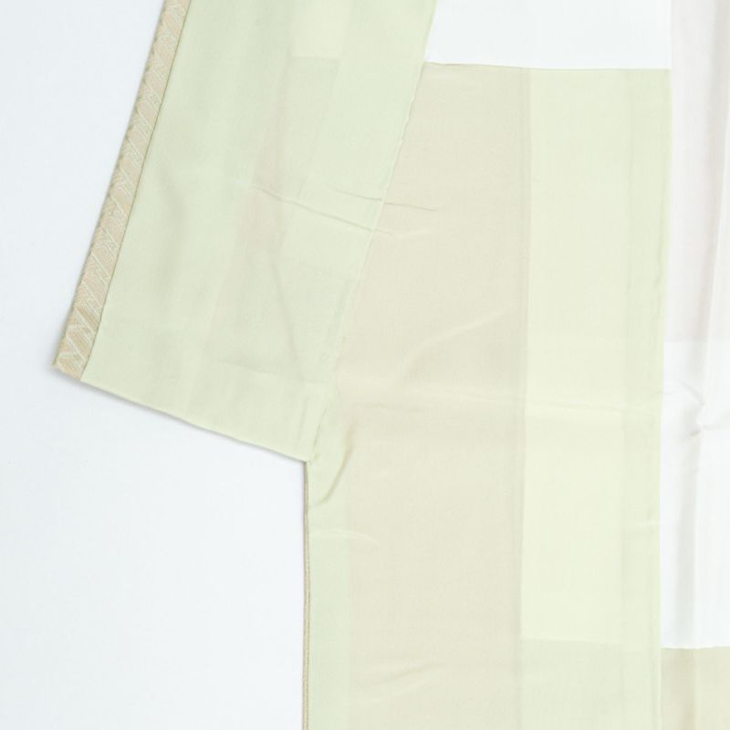 やや淡い白緑(びゃくろく)を基調に、青磁鼠(せいじねず)地模様の光沢が重なり、静謐で奥行きのある印象に仕上がっています。