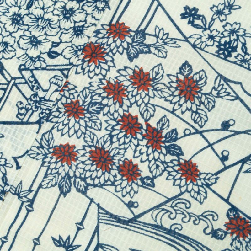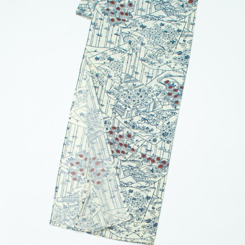 【訳あり品】小紋 綿絽 浴衣 型絵染 竹 扇面 四季花 調度品の図 単衣です。