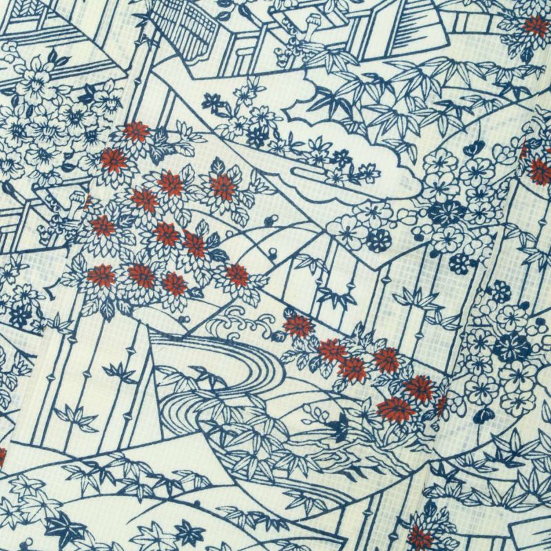 伝統的な和の情景が重なり合うように配された意匠は、奥ゆかしさの中に華やかさを感じさせ、どこか懐かしくも粋な趣を漂わせます。