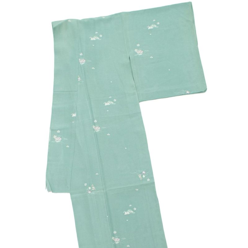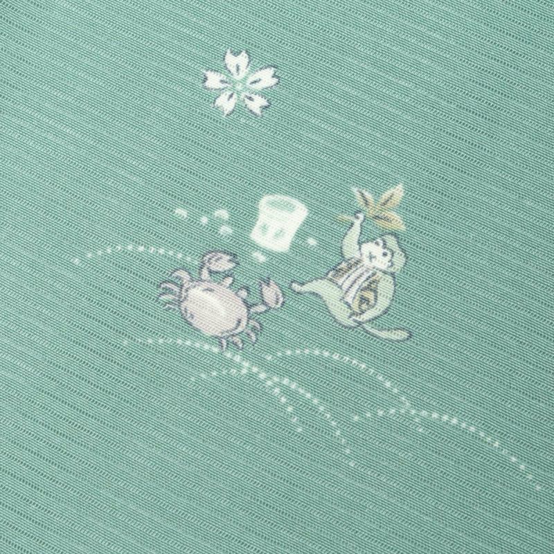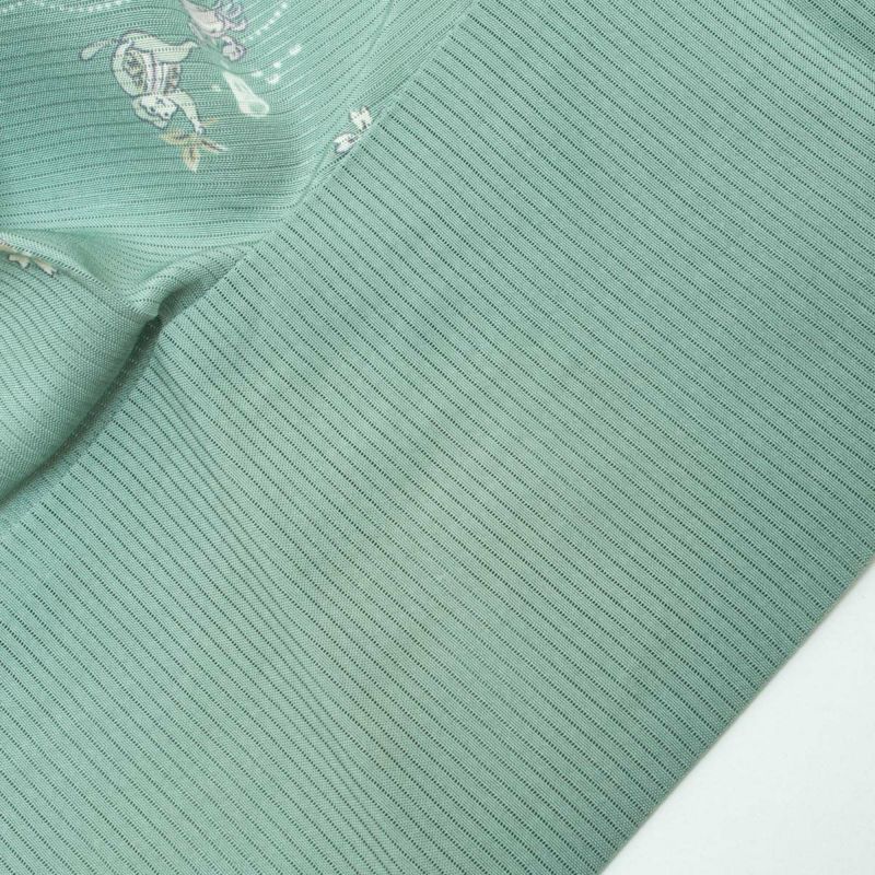 【単衣】飛び柄小紋 絽 童話柄 うさぎとかめ 一寸法師 さるかに合戦 青磁 正絹です。