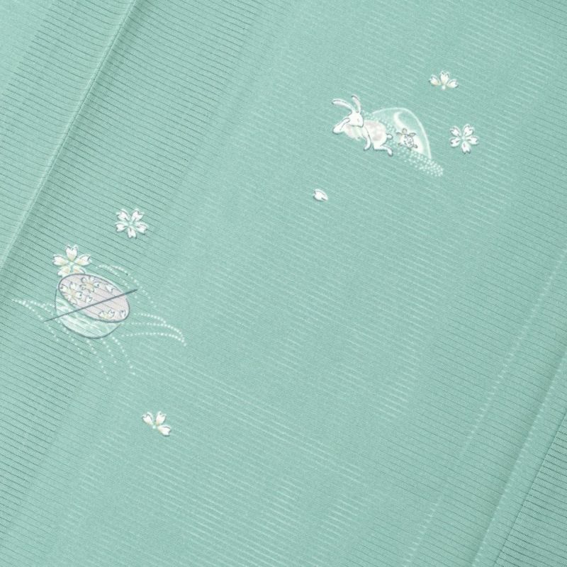 淡い青磁色の地に、絽ならではの軽やかな透け感を活かして、愛らしい童話のワンシーンが描かれています。