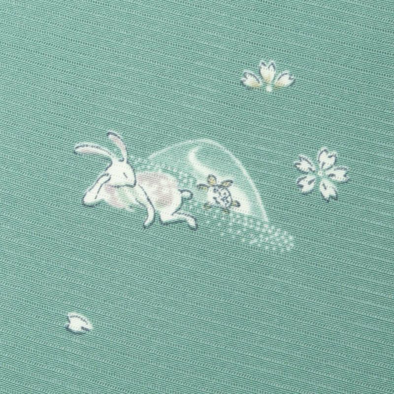 モチーフには「うさぎとかめ」「一寸法師」「さるかに合戦」など、日本人に馴染み深い昔話のキャラクターたちが登場。繊細な友禅で一つ一つ丁寧に表現され、着る人も見る人も心和む一枚です。