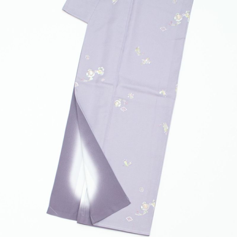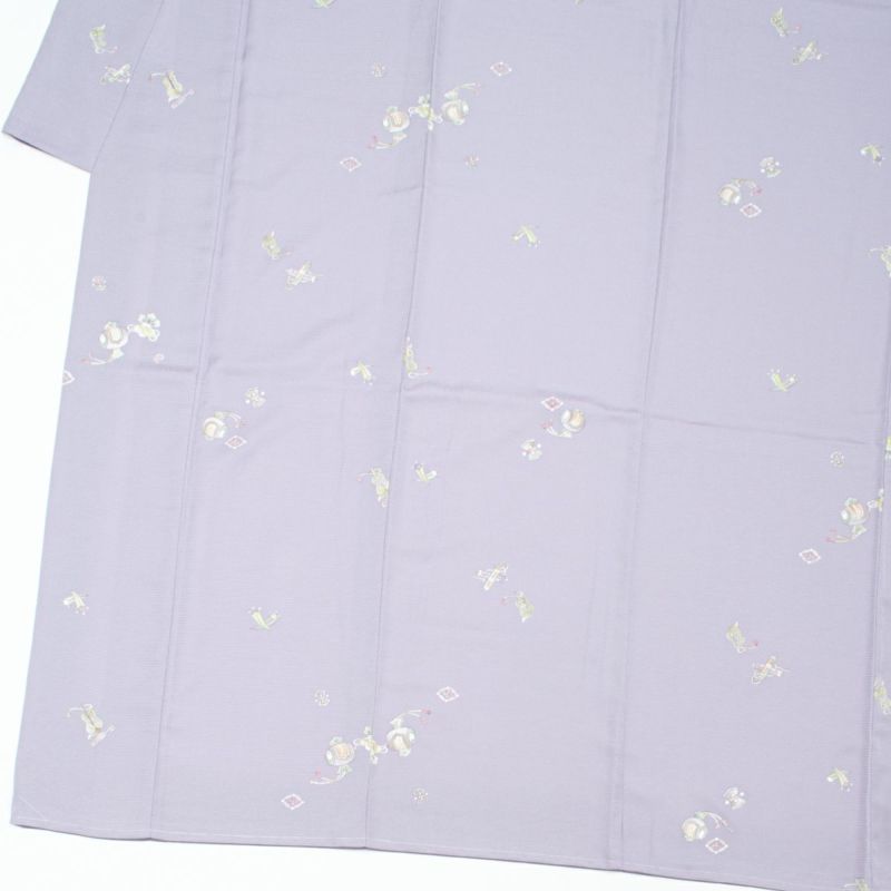 【美品】洗える着物 飛び柄小紋 宝尽くし フロッキー加工 藤色 高級ポリエステル 袷 身丈:約157cm 裄:約66cm