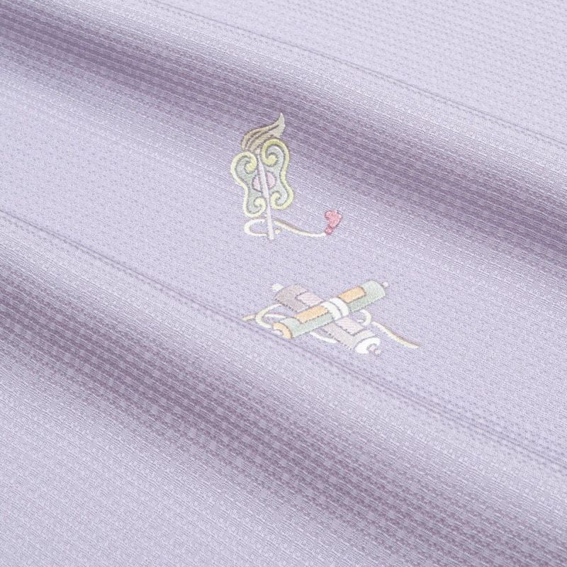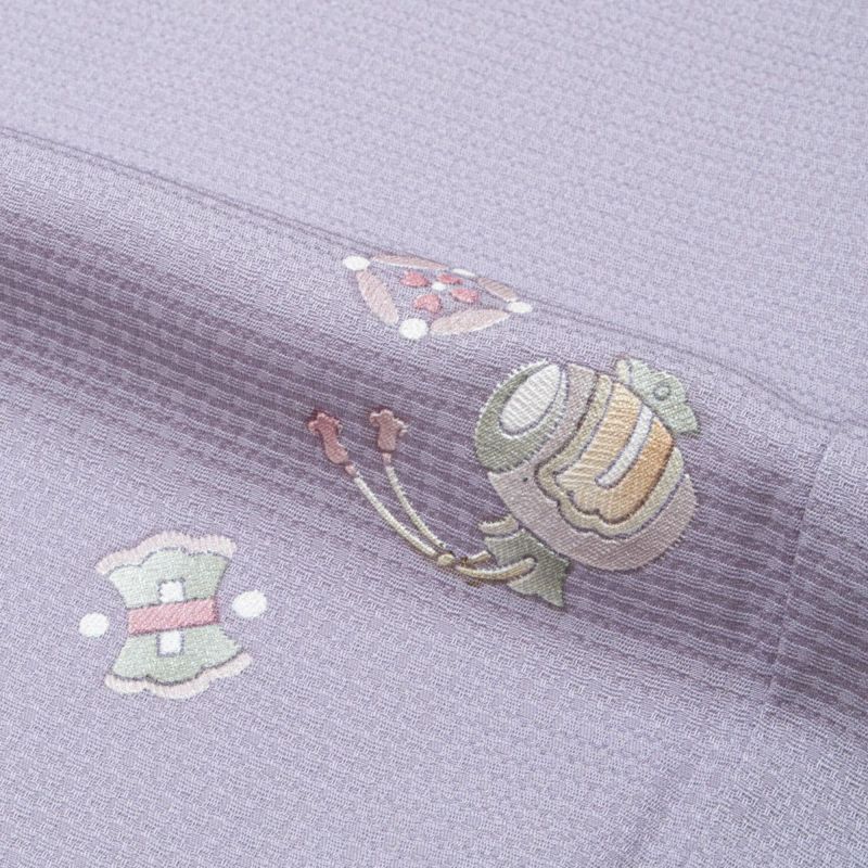 優美な藤色の地に、伝統的な宝尽くし文様が飛び柄で配された、高級感漂う洗える小紋です。