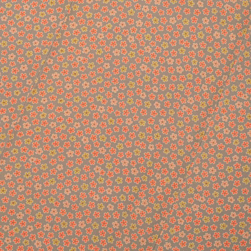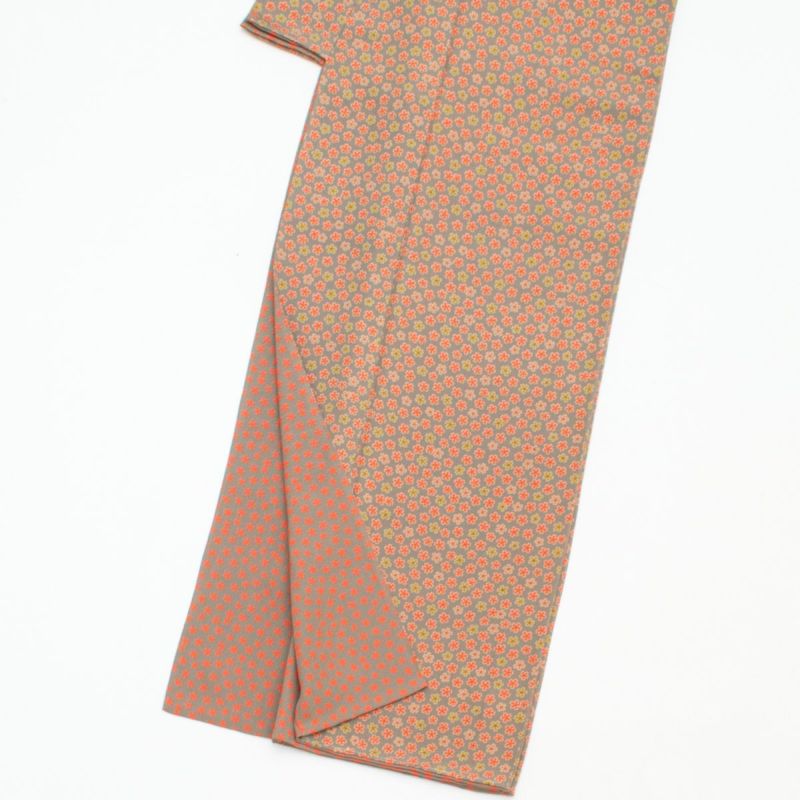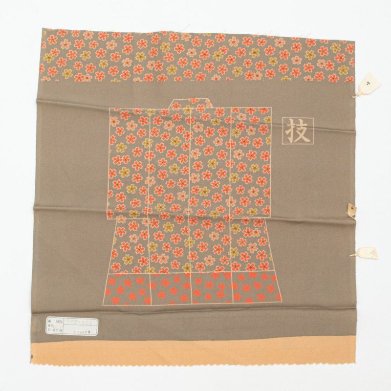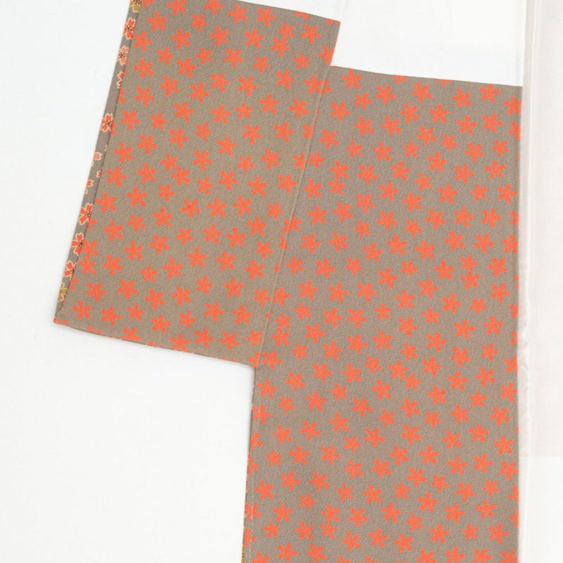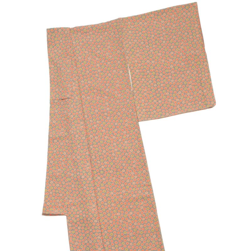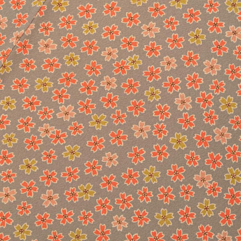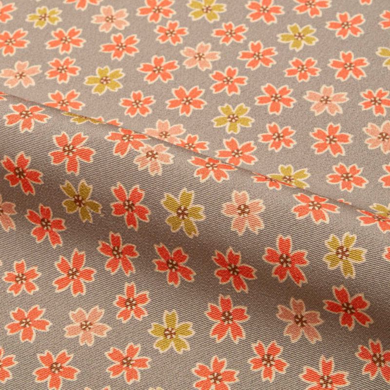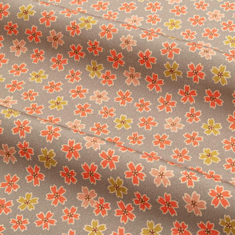 利休茶のやわらかな地色に、可憐な桜の花を友禅で散りばめた小紋です。