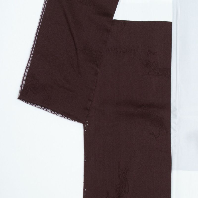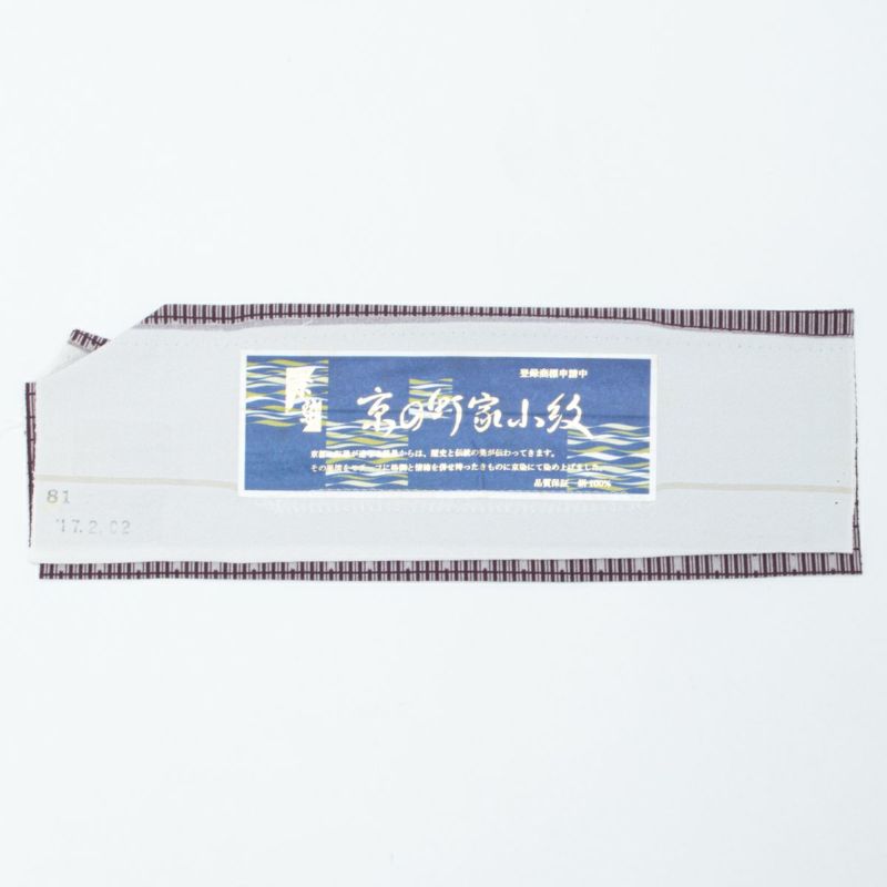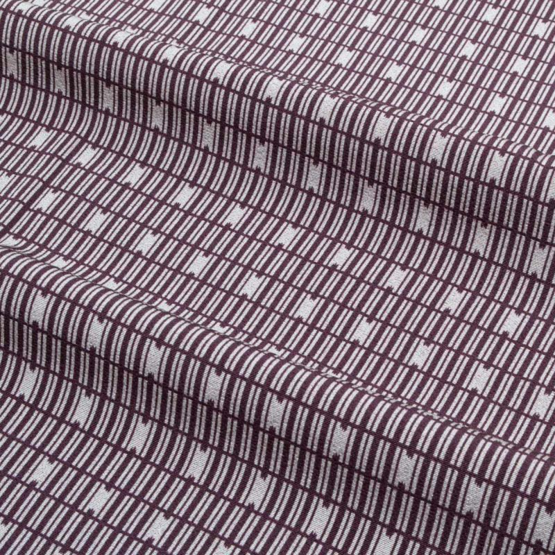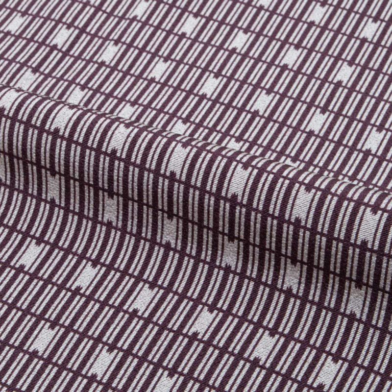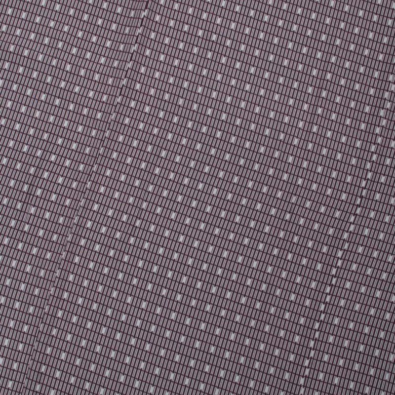 細やかな格子文様は、京都の町家建築を思わせる風情あるデザイン。紫とグレーの落ち着いた色調がリズミカルに並び、洗練された大人の装いを演出します。