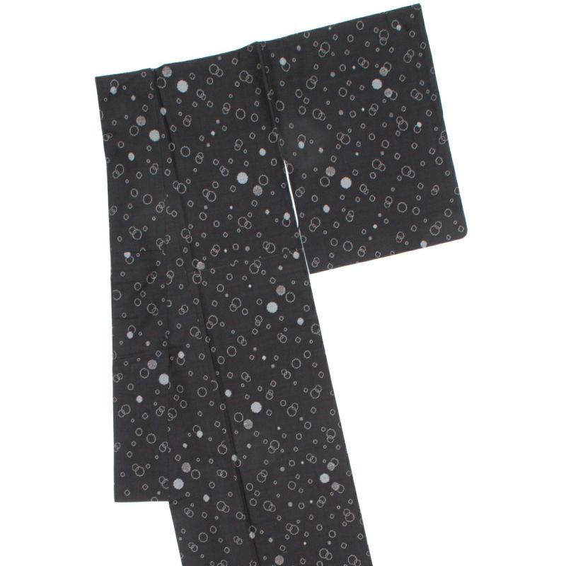 深みのある鉄黒の地色に、大小の水玉がリズミカルに散りばめられた、愛らしさと品の良さが共存する一枚です。
