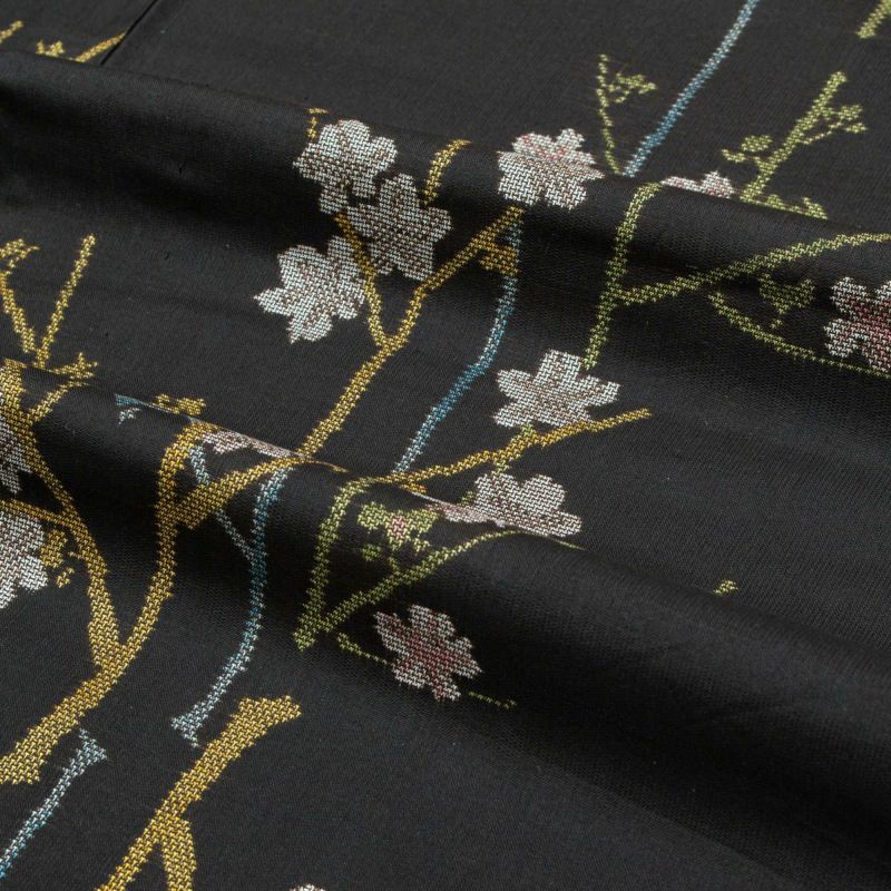 深みのある黒地に、繊細な桜文様が絣で表現され、品格と華やかさを兼ね備えた意匠となっております。