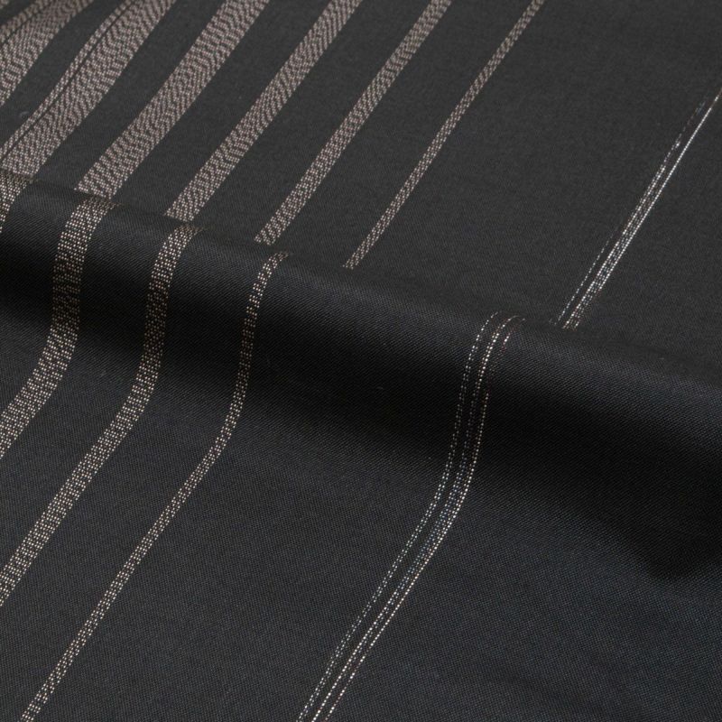 本場大島紬ならではの深みある“泥染め”の黒地に、すっきりとした縞文様を配した一枚です。