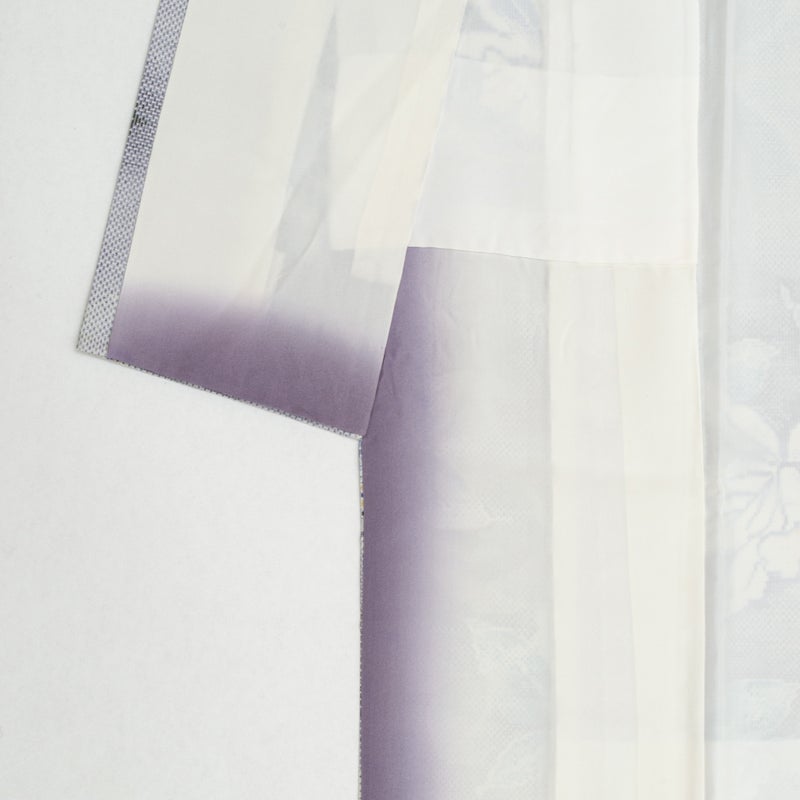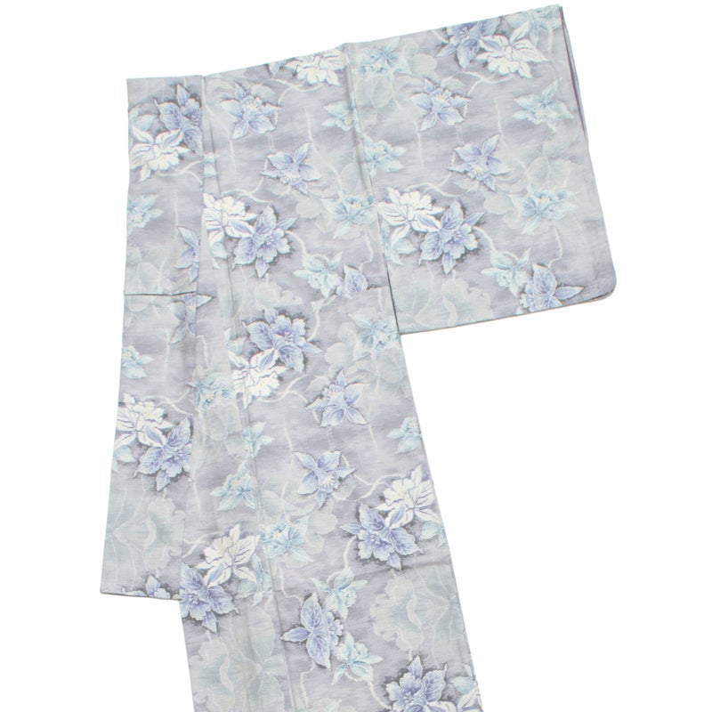 細やかな織りによる白大島ならではの軽やかな地風に、かすれたような陰影が重なり、洋花更紗調の意匠が奥行きある表情を生み出しています。