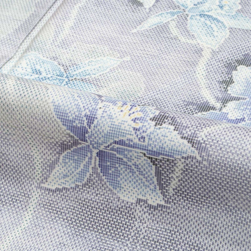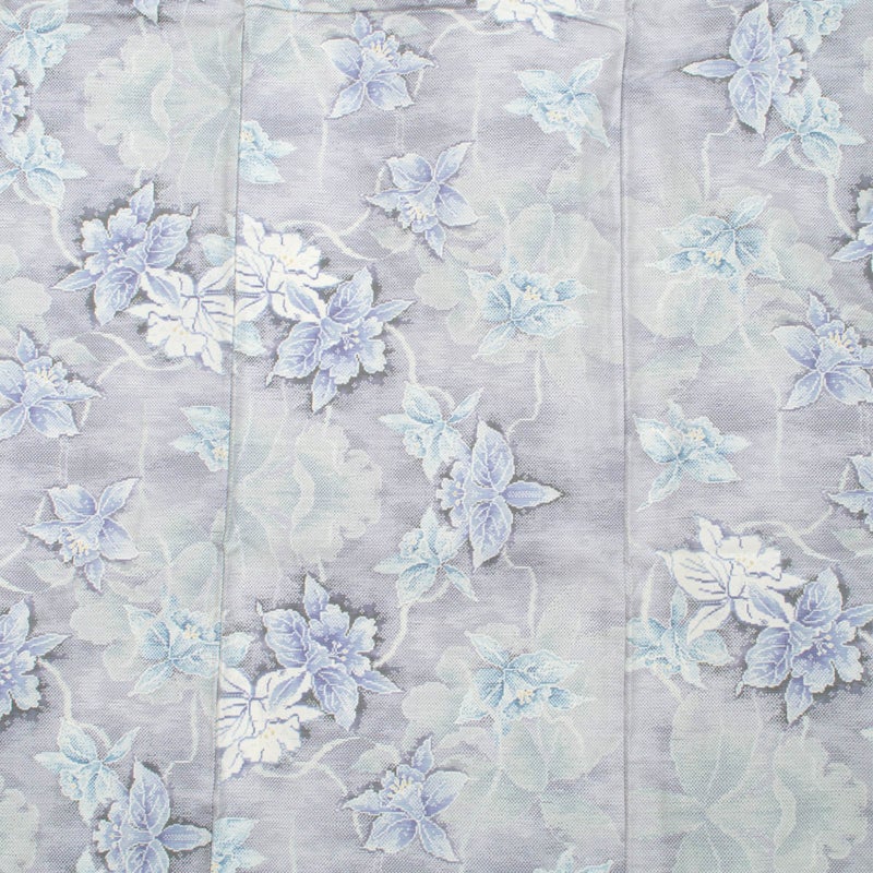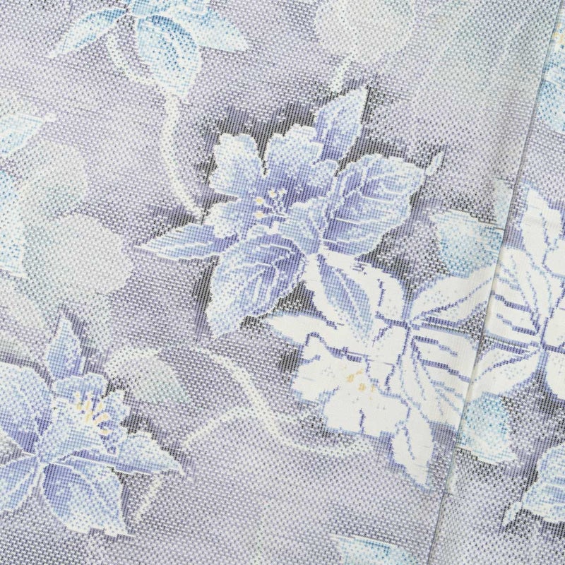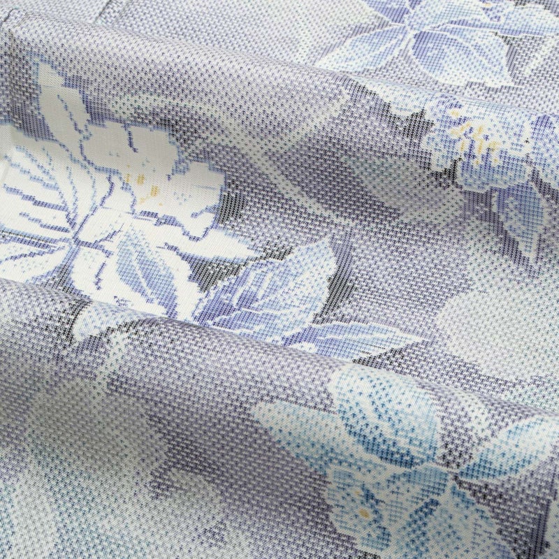 やわらかなライトブルーを基調に、青紫の濃淡で洋花が表現された本場大島紬です。