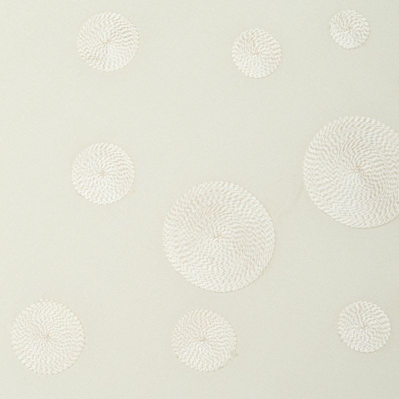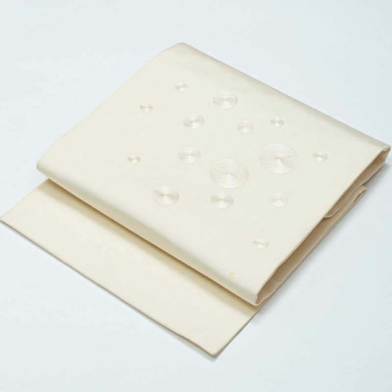 やさしいオフホワイト地に、精緻なサークル刺繍が施された塩瀬の名古屋帯です。