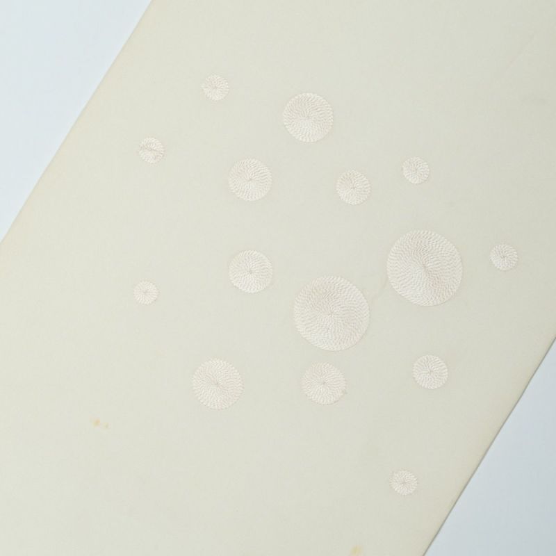 【訳あり品】名古屋帯 塩瀬 サークル刺繍 オフホワイト 正絹 九寸 です。