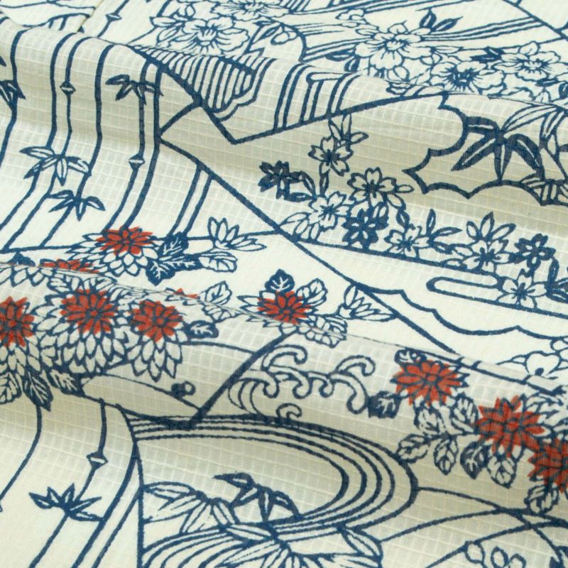 夏らしい爽やかな風合いが魅力の綿絽素材に、繊細な型絵染で竹や扇面、四季の花々、調度品が細やかに描かれた小紋です。
