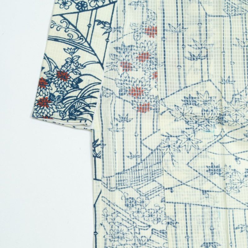 【訳あり品】小紋 綿絽 浴衣 型絵染 竹 扇面 四季花 調度品の図 単衣です。