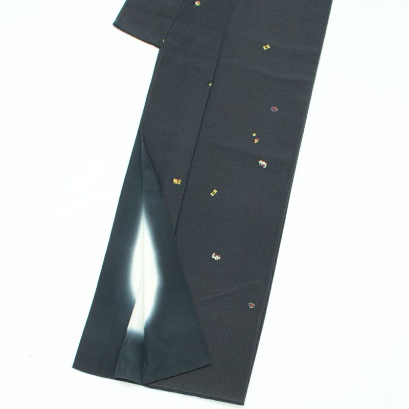 落ち着いたチャコールグレーの地に、手描き友禅で可愛らしい張り子の玩具を散らした、愛らしくも品のある小紋です。