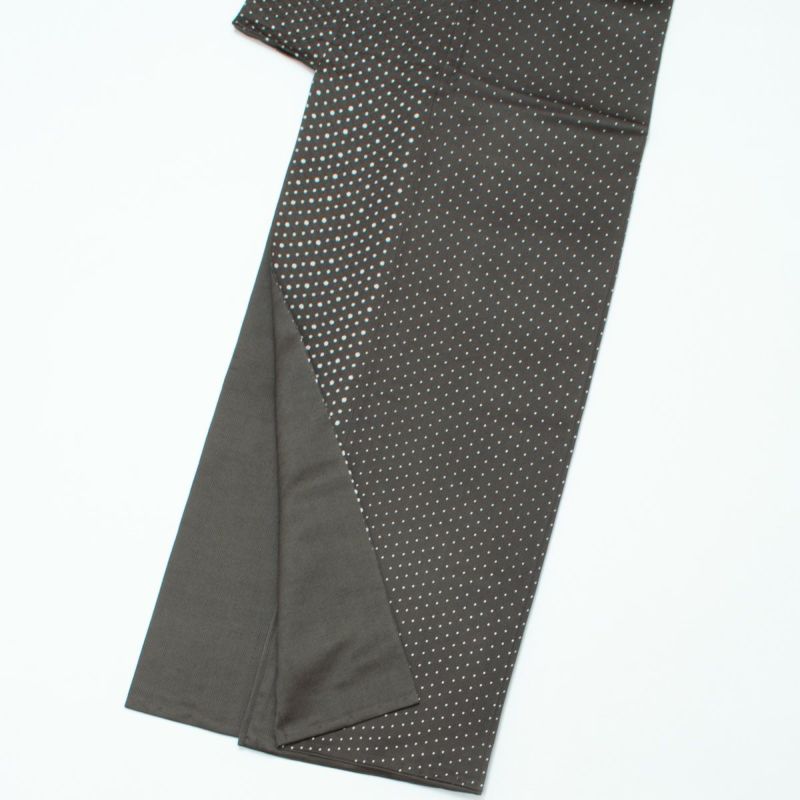 上品な紫鼠色の地に、大小の白いドットが散りばめられた粋な小紋です。
