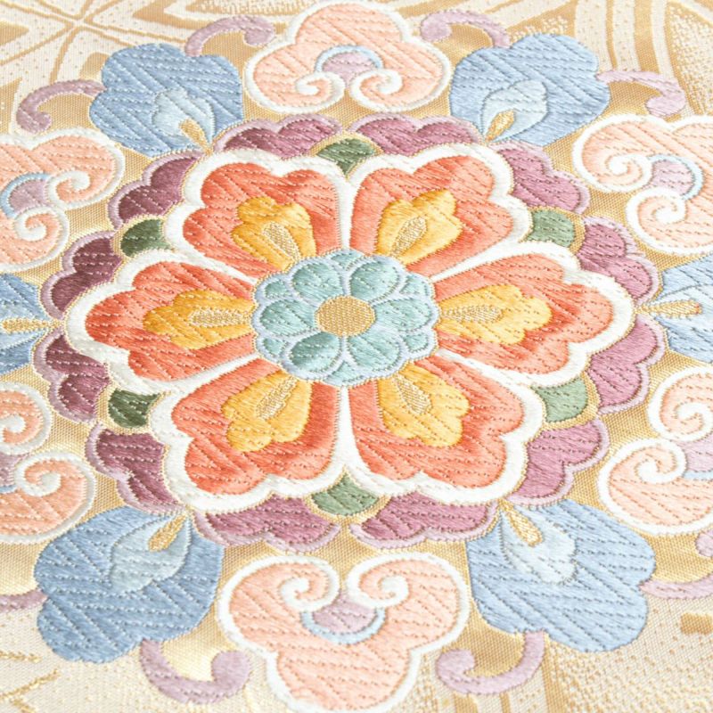 そこに、淡く優しいパステルトーンの花文が散りばめられ、可憐でありながら落ち着いた印象に仕上がっています。
