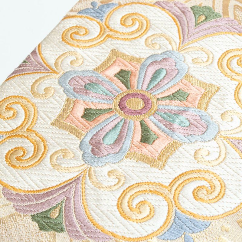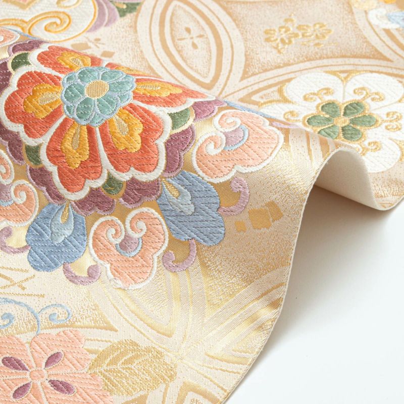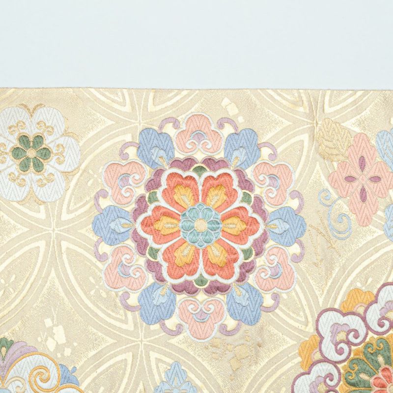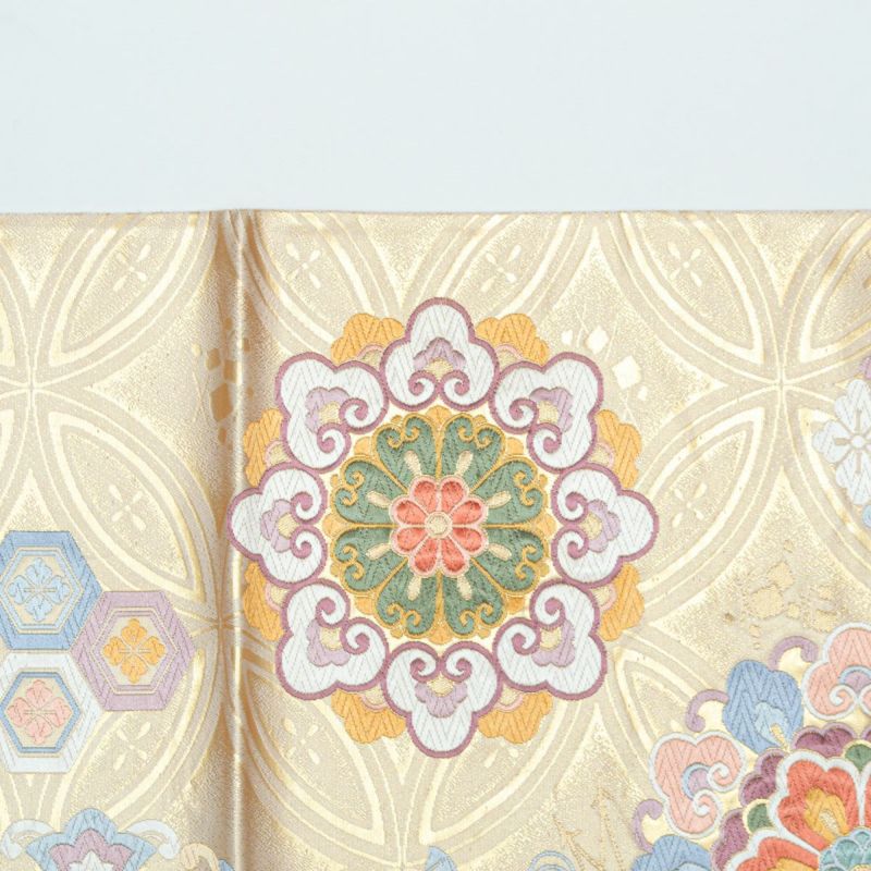 【美品】袋帯 唐織 唐花文 七宝繋ぎ パステルカラー ゴールド 金彩 西陣織 正絹 礼装用 です。