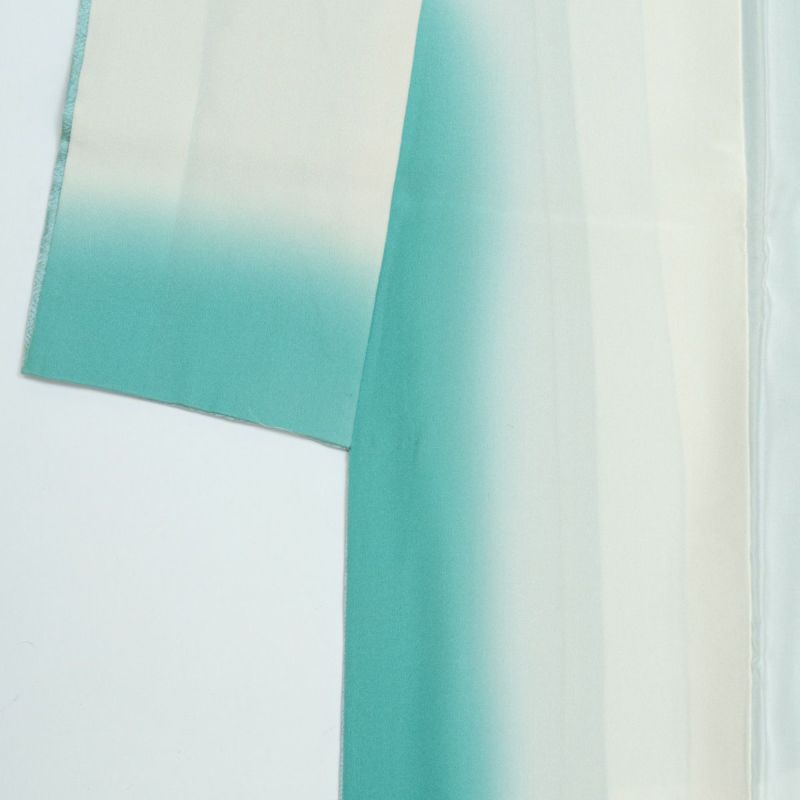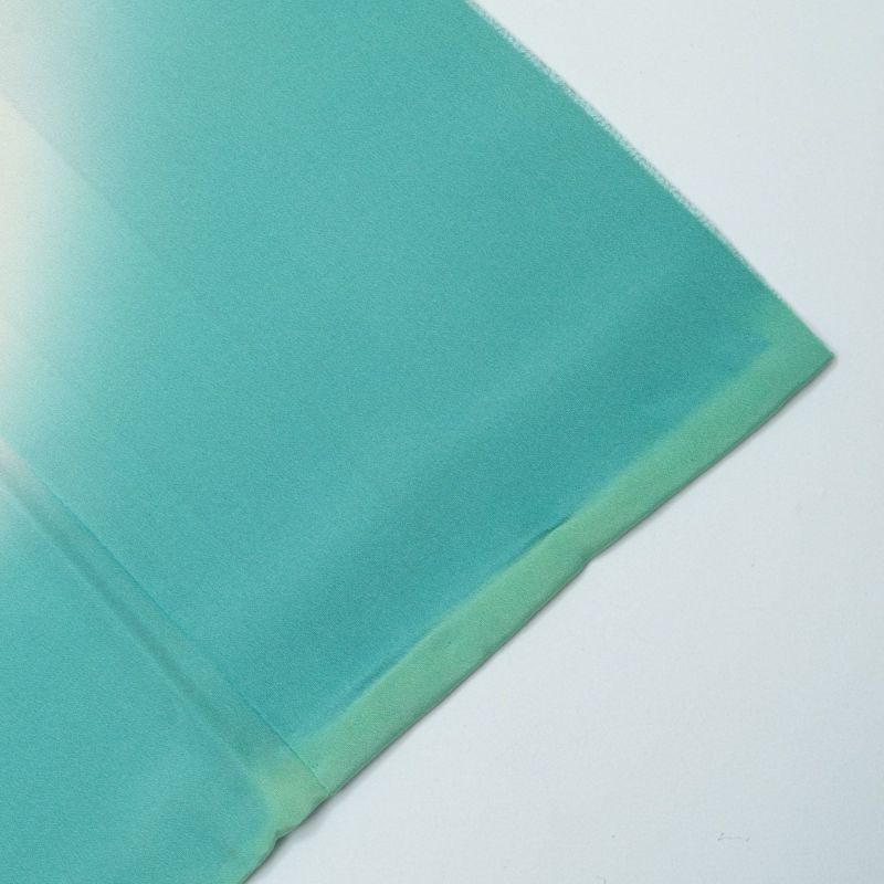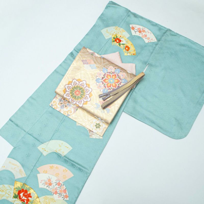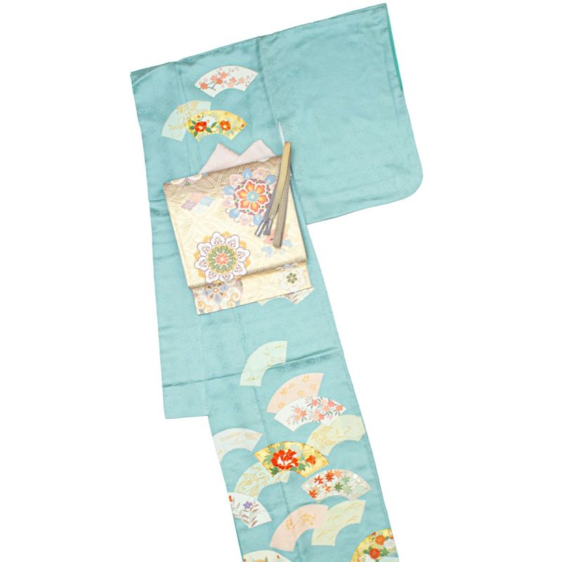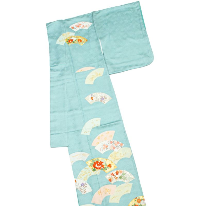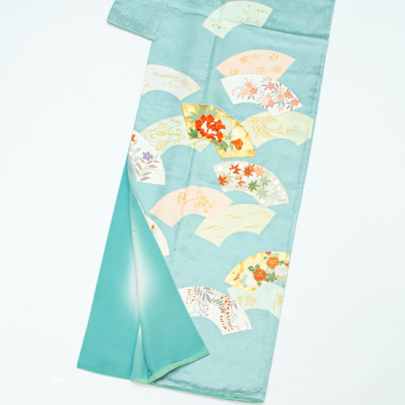 柔らかく澄んだ瓶覗(かめのぞき)色の地に、扇面文様が軽やかに配された訪問着です。