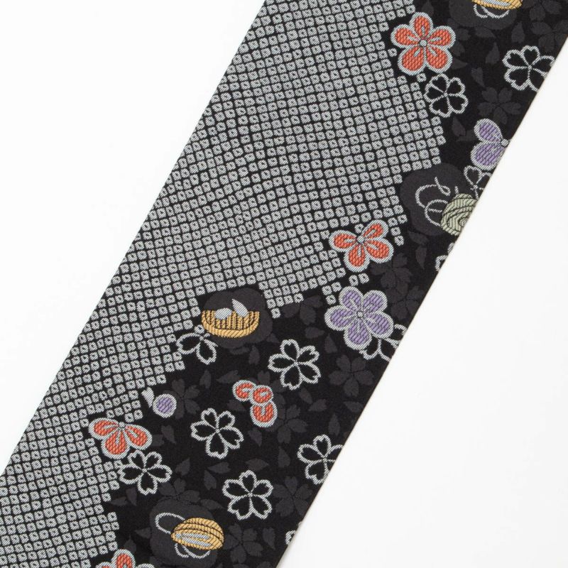 お太鼓柄には桜文様をベースに、駒・ぽっくり・簪といった女の子の持ち物が小さく織り込まれており、どこか懐かしく遊び心を感じさせる意匠です。