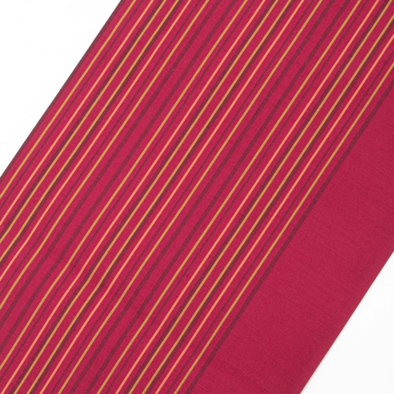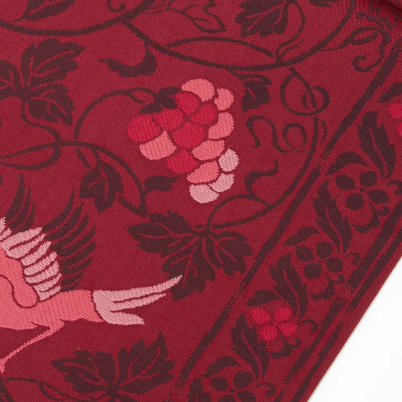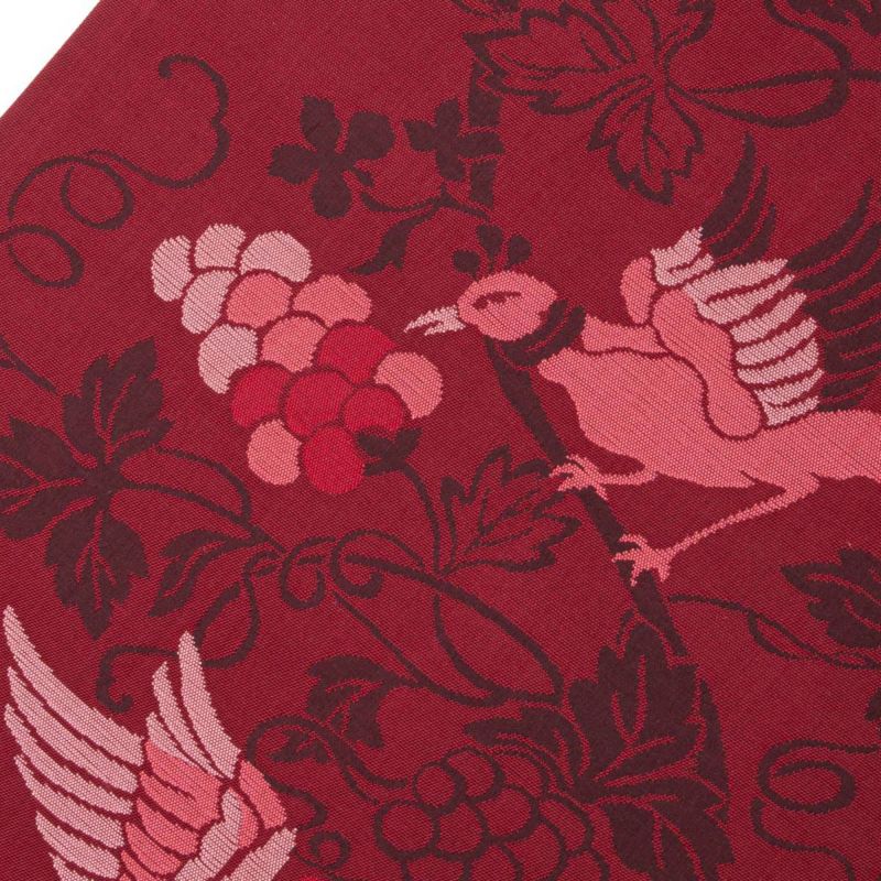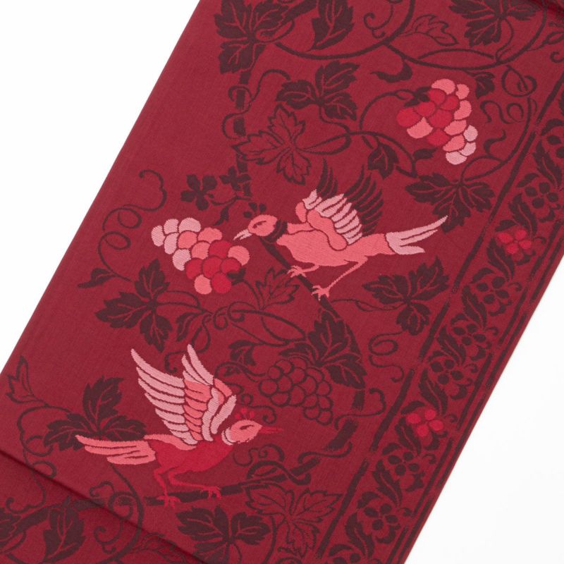 深みのある葡萄色を地に、唐草の蔓が全体に伸び、ところどころに瑞鳥(ずいちょう)が葡萄の実に戯れる姿が描かれています。文様は織りによって表現され、色数を抑えながらも濃淡で立体感を演出しています。