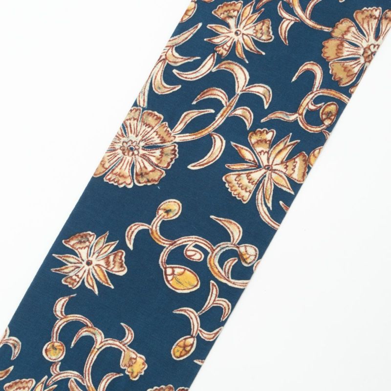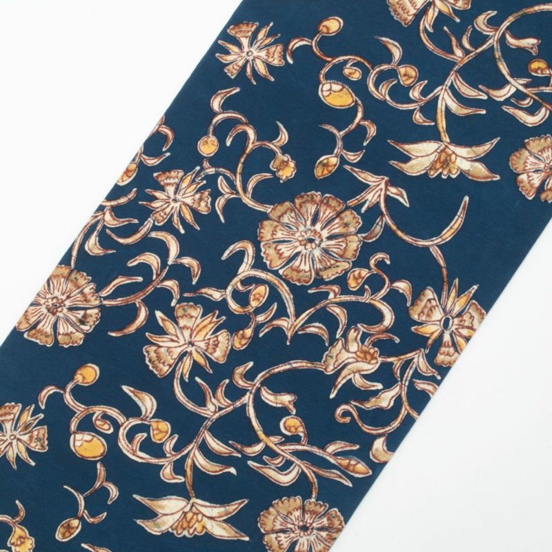 名古屋帯 ろうけつ染め 花唐草 更紗文様 紺色 正絹 九寸です。