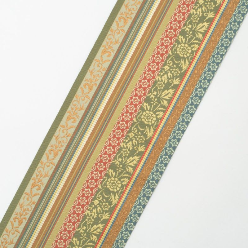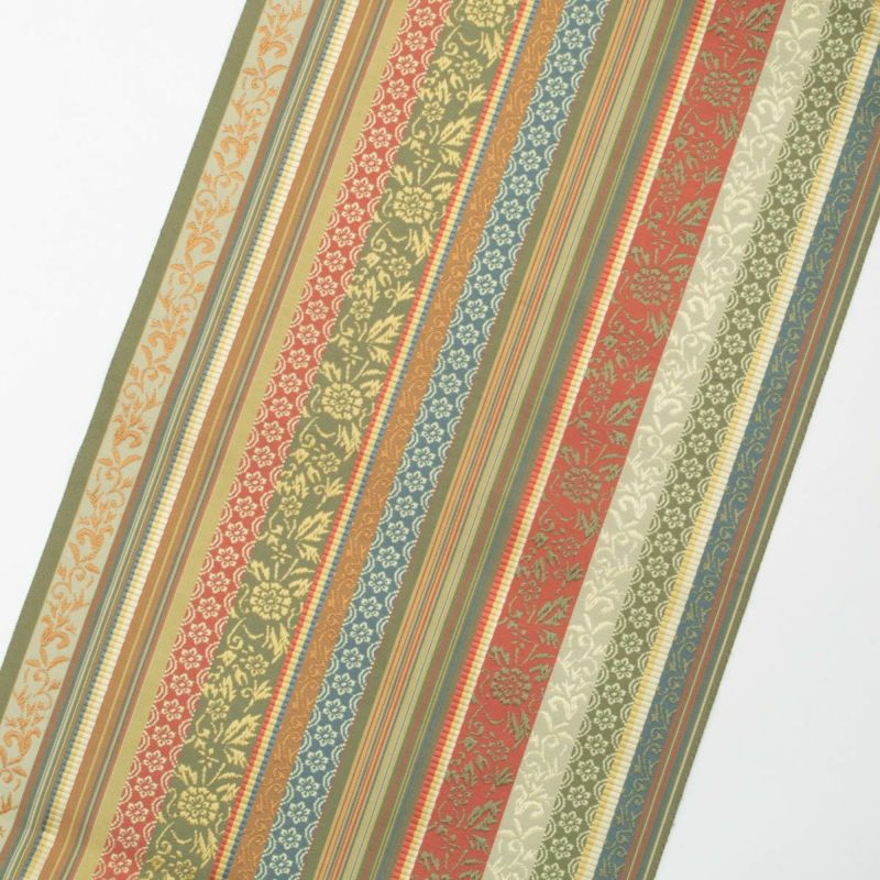 格調高い献上柄をベースに、黄緑・青緑・赤・山吹色などの華やかな色使いと繊細な織柄が交錯し、帯全体にリズムと華やぎをもたらします。