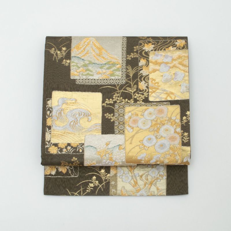 金銀糸を織り交ぜ、浜千鳥、富士山、波文、四季折々の花々など、吉祥と自然美を重ねた意匠が格調高くあしらわれています。