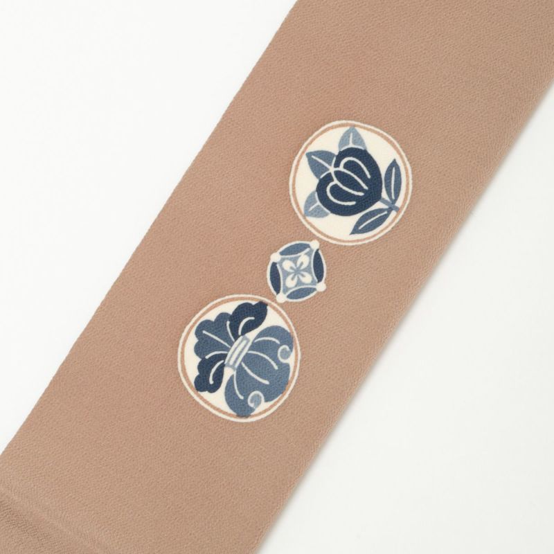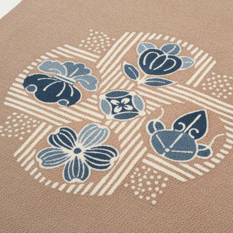 茶鼠色の地に、藍や水色、白のコントラストが美しく映え、優しさと品格を兼ね備えたデザインです。