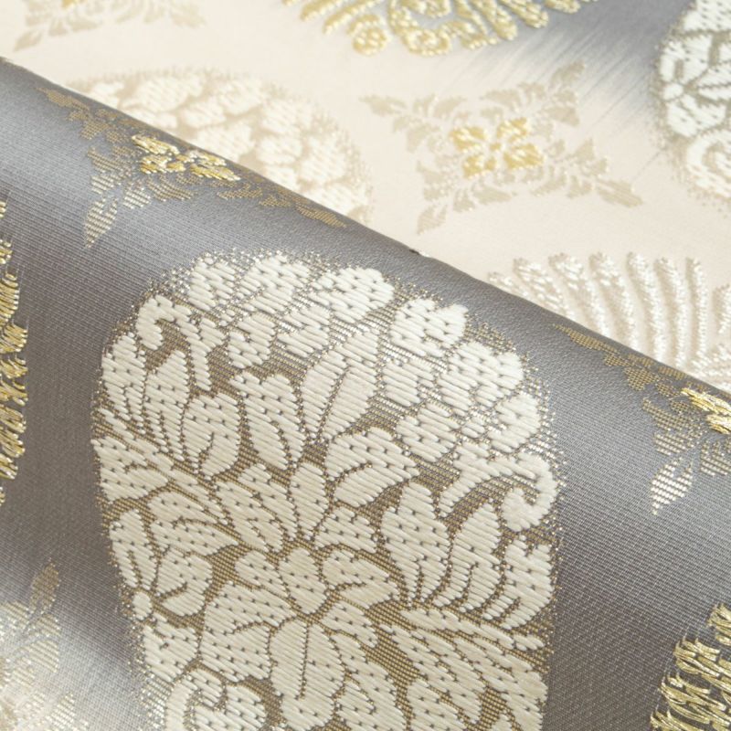 染めのように見える美しい暈し横段の地色には、オフホワイトからグレーへの滑らかなグラデーションが施され、金糸と銀糸を巧みに織り込んだ唐織の文様が立体的に浮かび上がります。
