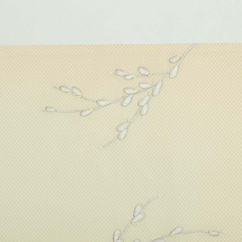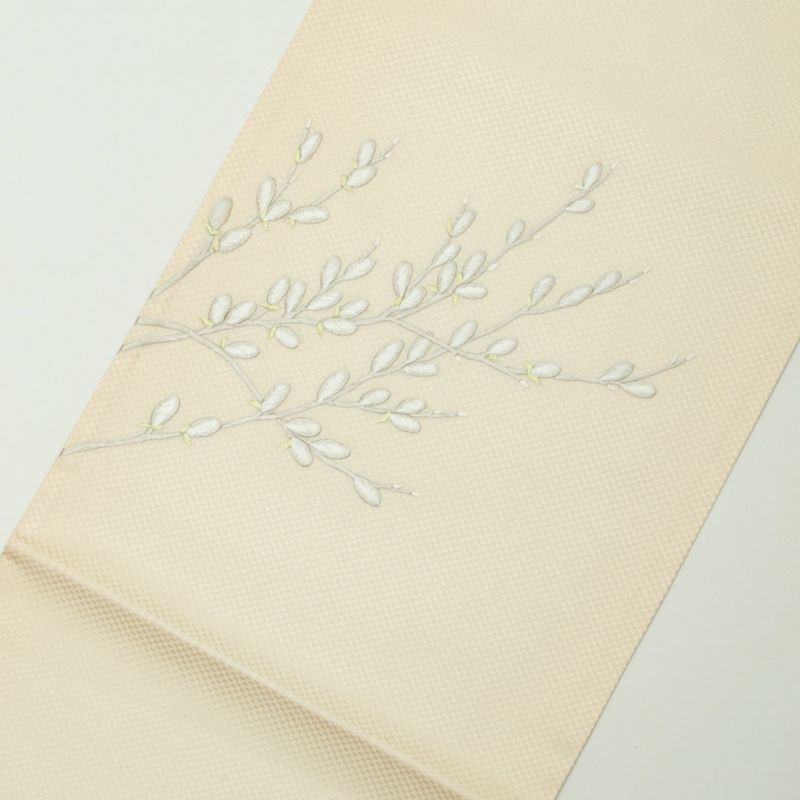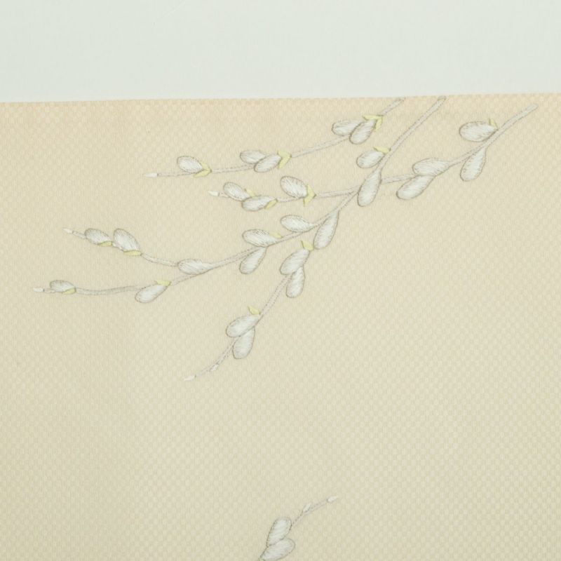やわらかな光をまとったような、優しいオフホワイト地に、猫柳の枝を繊細な刺繍であしらった開き名古屋帯です。