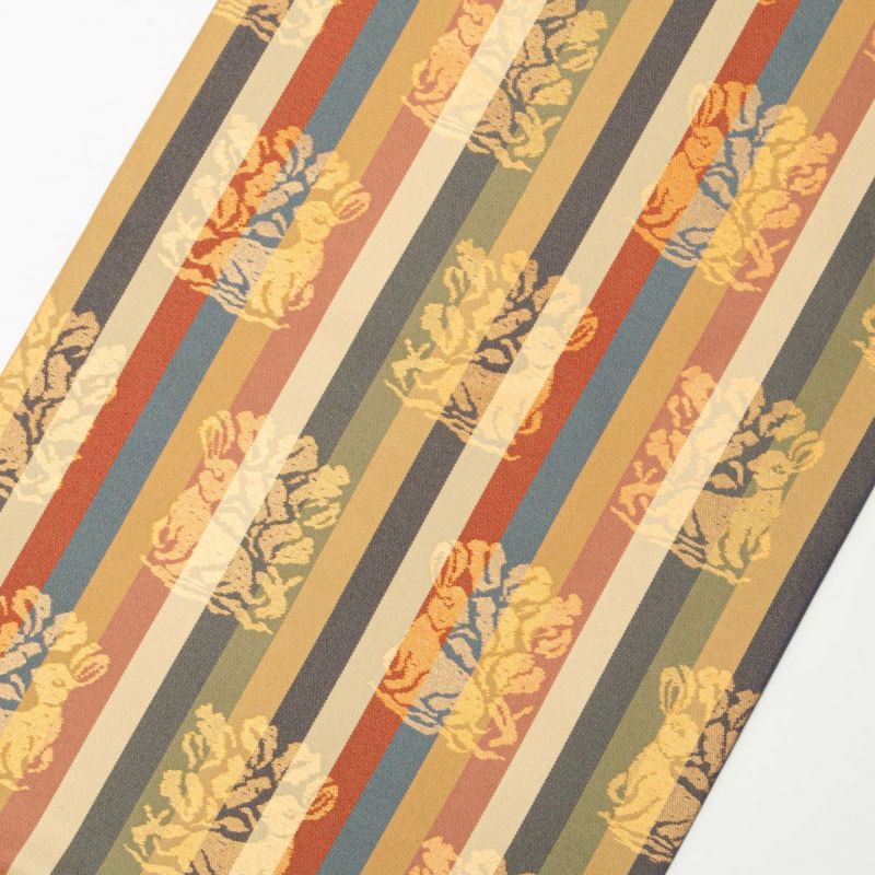 名物裂の意匠を縞状に配し、兎と草花の文様を織り込んだ、西陣織の袋帯です。