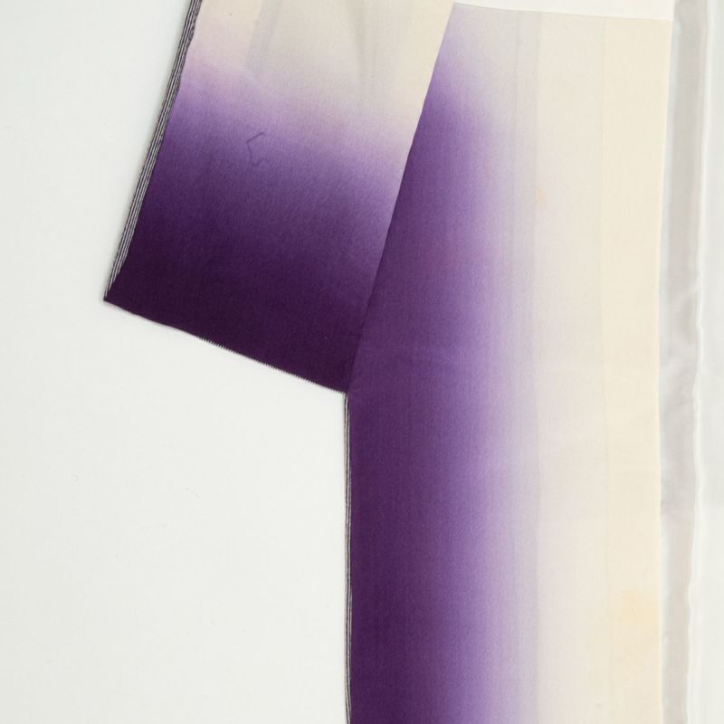 紫と白の上品な色合いで、落ち着いた雰囲気を漂わせる一着。格調高い文様は、茶席やお稽古、観劇など幅広いシーンで重宝します。
