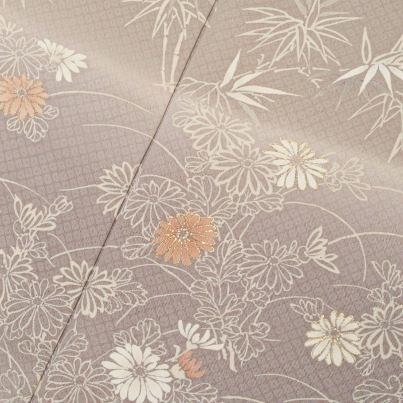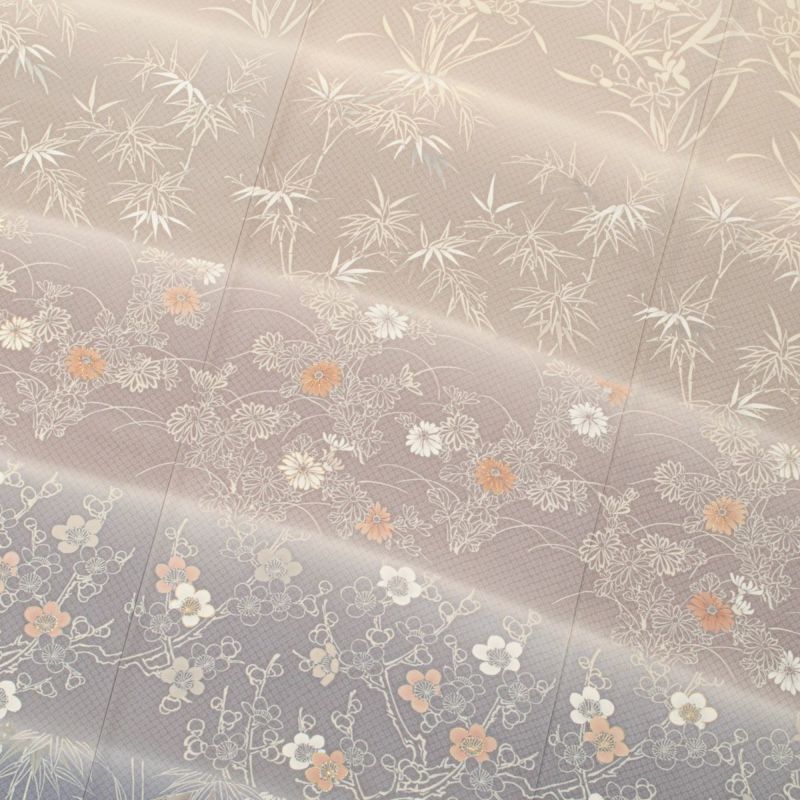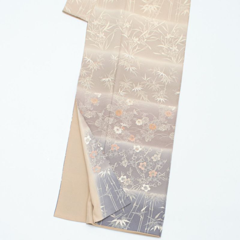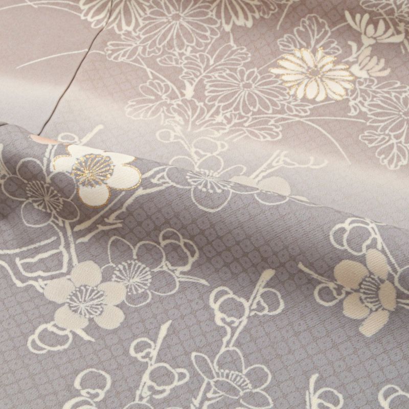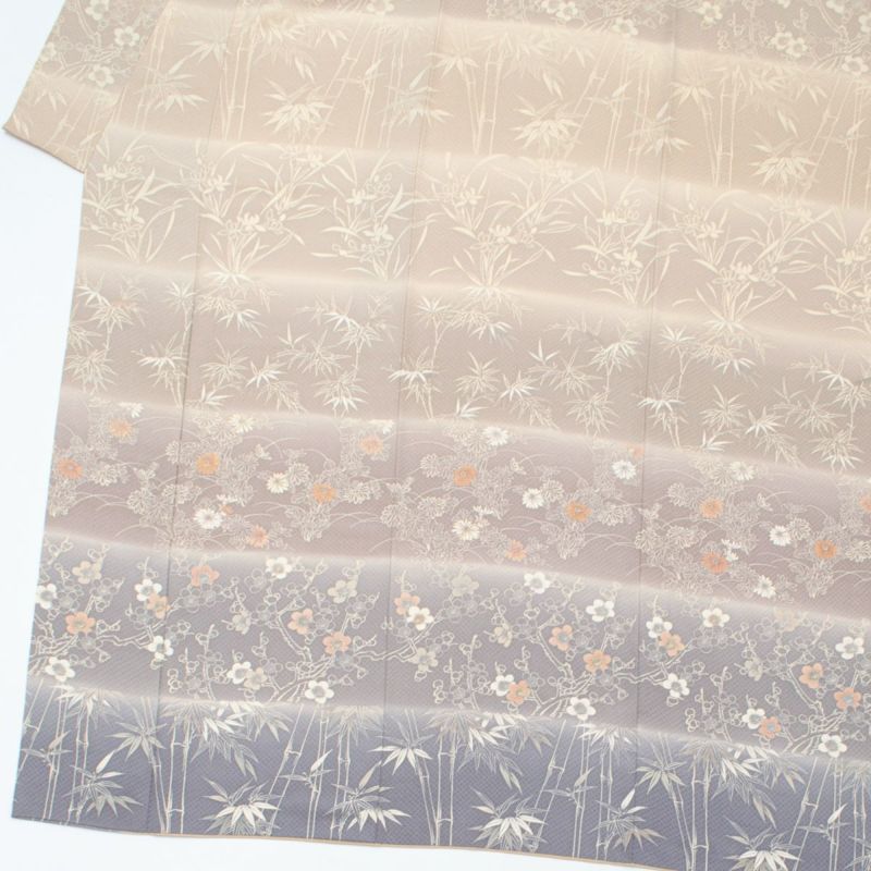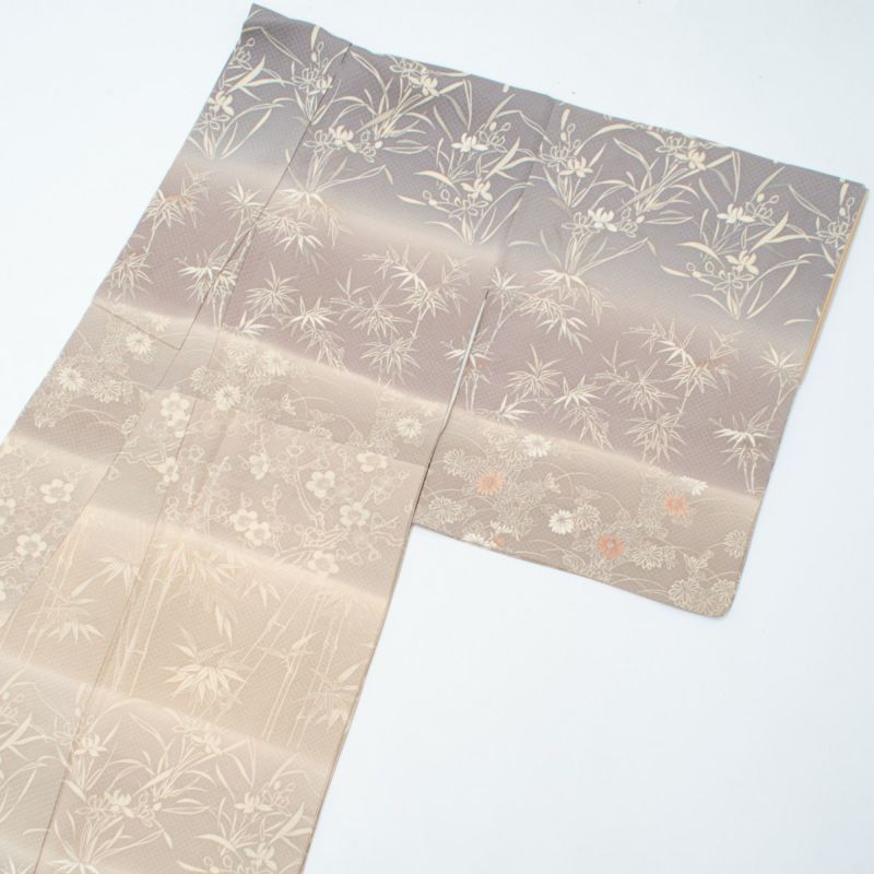 細かな疋田文の地紋を持つ生地に、品のあるグレージュと藤鼠の濃淡が美しく暈し染めされ、落ち着いた中に華やかさを感じさせます。