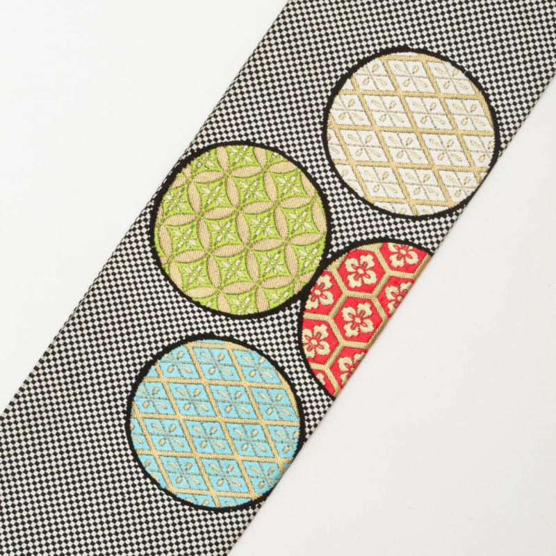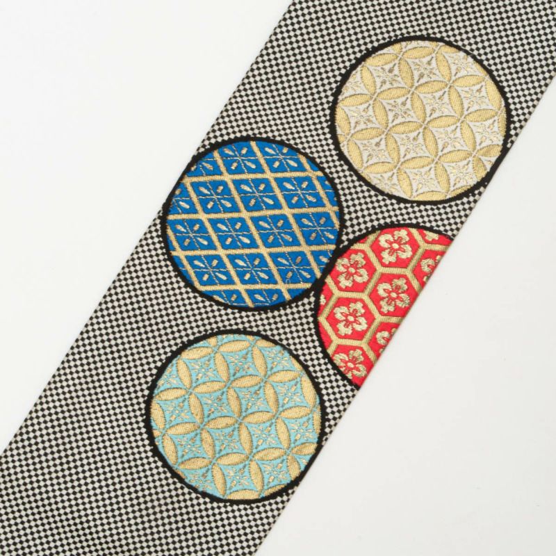 名古屋帯 割付文様 丸文 市松格子 黒 白 マルチカラー 西陣織 正絹 九寸 です。