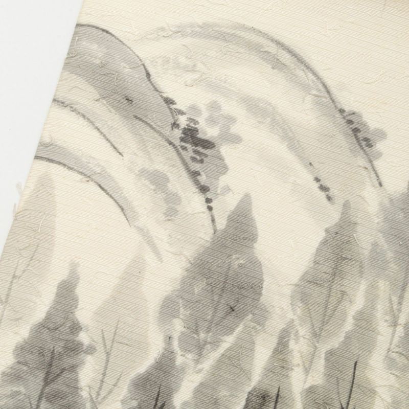 繊細なオフホワイトのひげ紬地に、淡墨への暈しが美しく、静寂な森の気配が帯全体に広がります。
