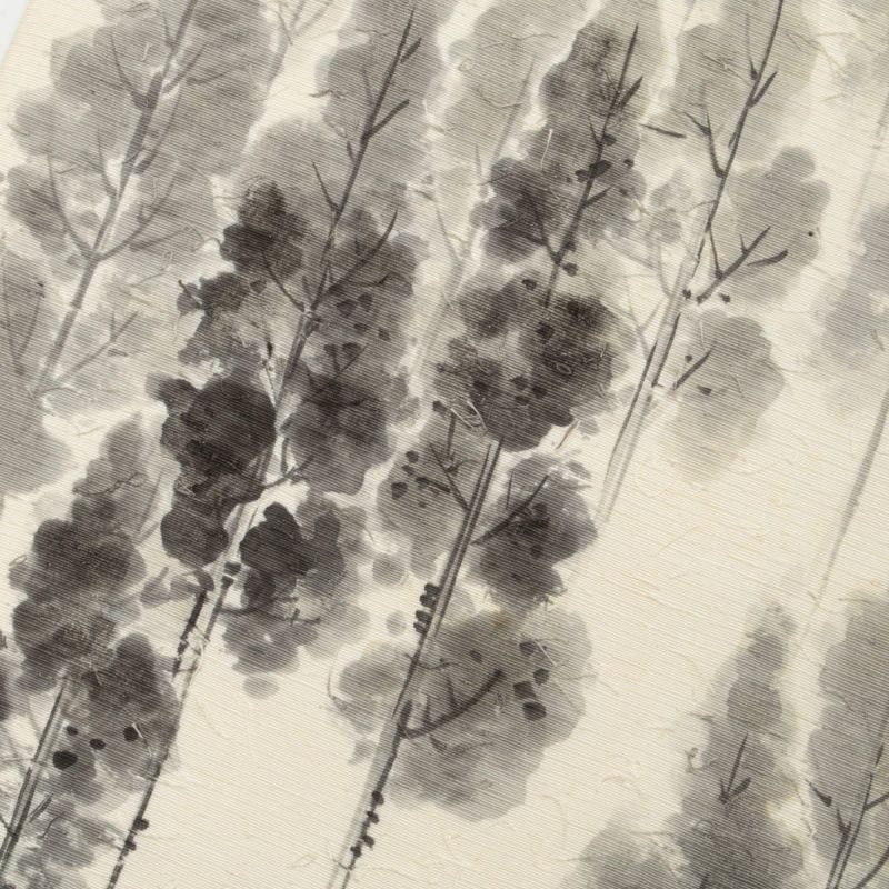 墨の濃淡によって表現された静謐な北山杉の姿は、奥行きと静けさを感じさせ、まるで一幅の水墨画のよう。