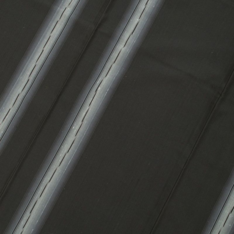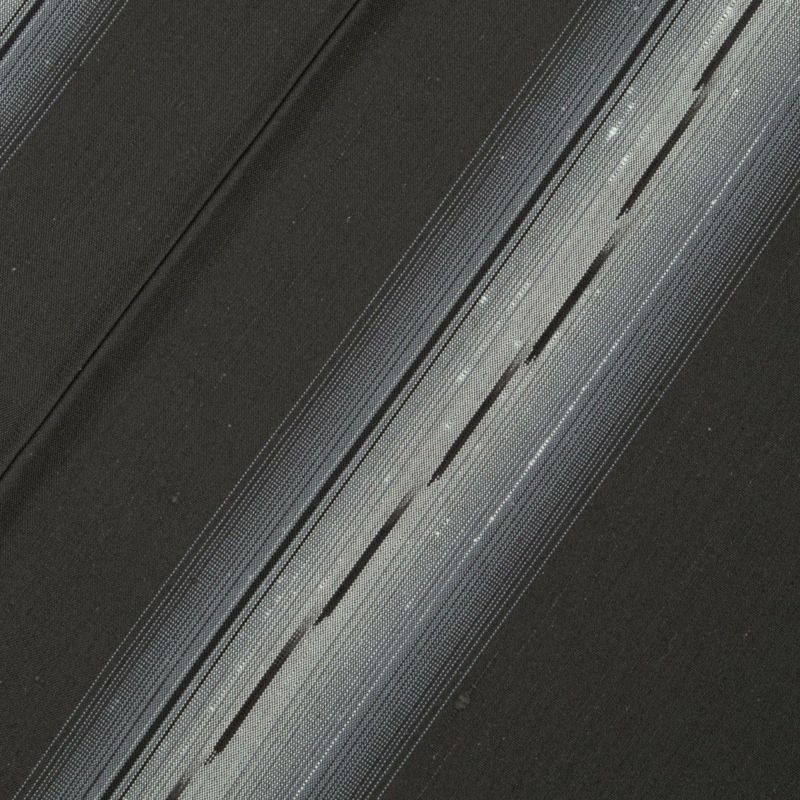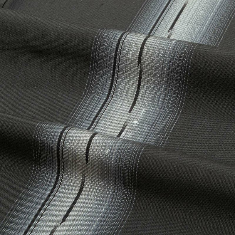 墨黒から銀鼠へのぼかしが効いた縞が、凛とした存在感を放ちつつも、柔らかな印象を与える一枚です。