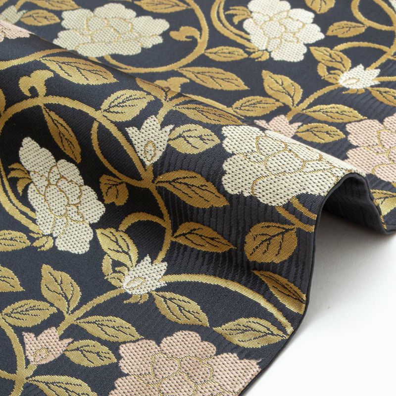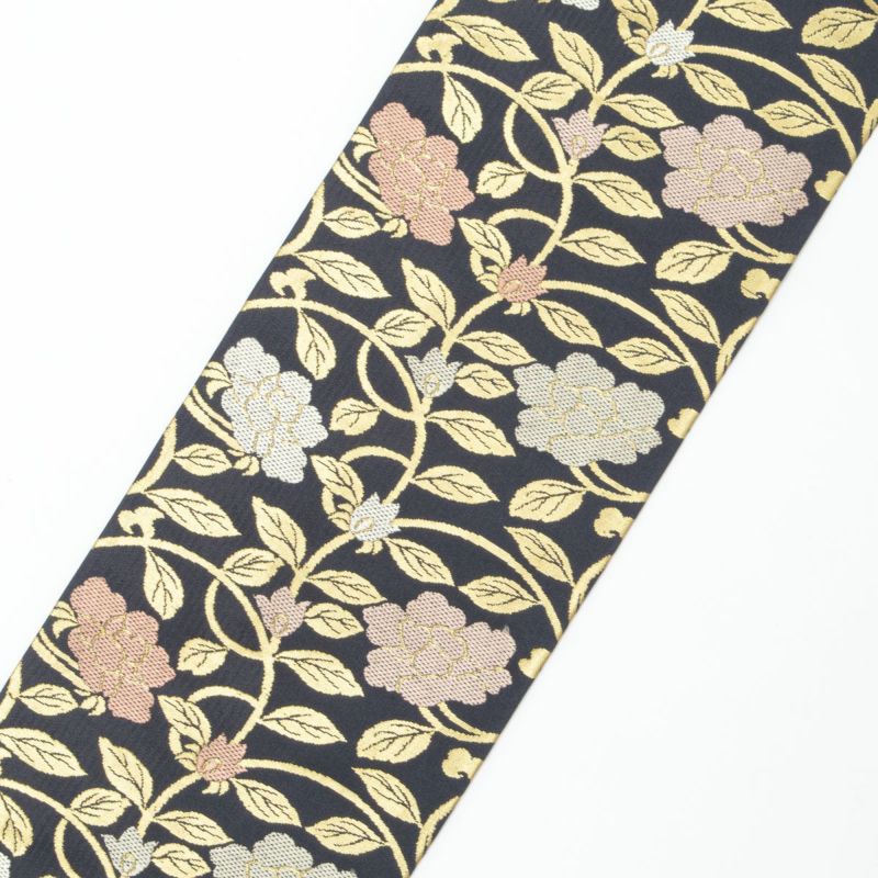 牡丹の花と唐草をあしらった格調高い意匠が目を引く、西陣織の名古屋帯です。