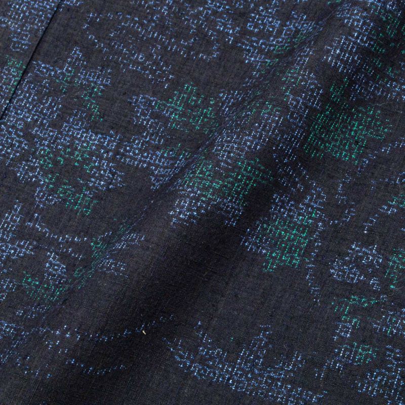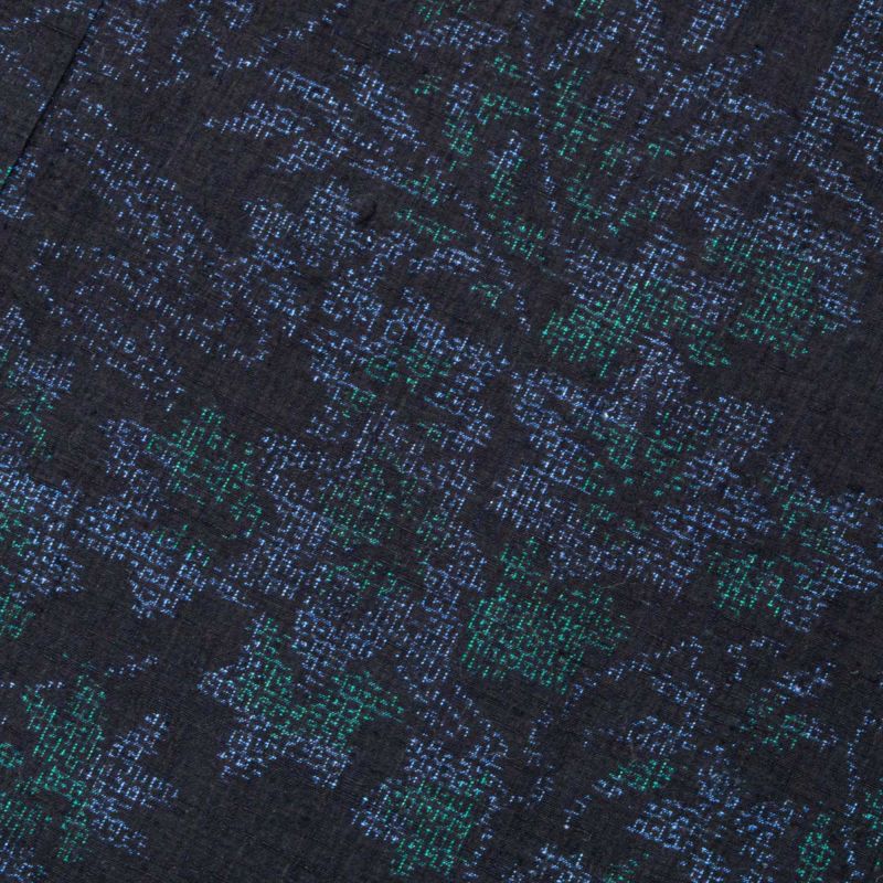 濃紺の地に細やかな亀甲絣が全体に織り込まれ、几帳文様や植物文が美しく浮かび上がる意匠です。