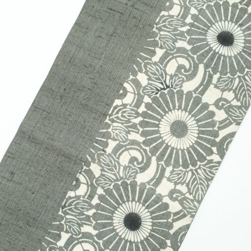 落ち着いたグレーの真綿紬地に、型絵染めによる菊唐草文があしらわれた、上質な名古屋帯です。