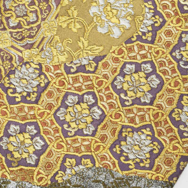 紫・黄土・金・銀など多彩な色調が調和し、装いに深みと華やぎを添える一本です。