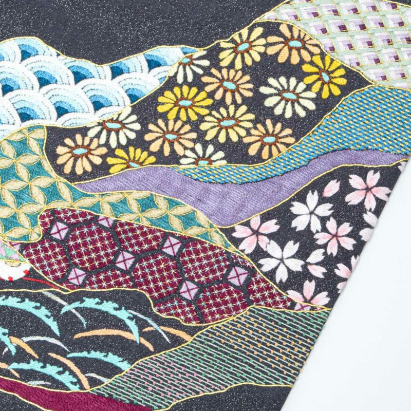 お太鼓部分には、道長取りの構成の中へ、雪の結晶や太鼓の柄と、多彩な割付文様が贅沢に配され、桜・菊・青海波・麻の葉など、伝統柄が色とりどりに重なり合う華やかな仕上がりです。
