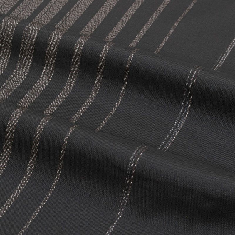 本場大島紬ならではの深みある“泥染め”の黒地に、すっきりとした縞文様を配した一枚です。