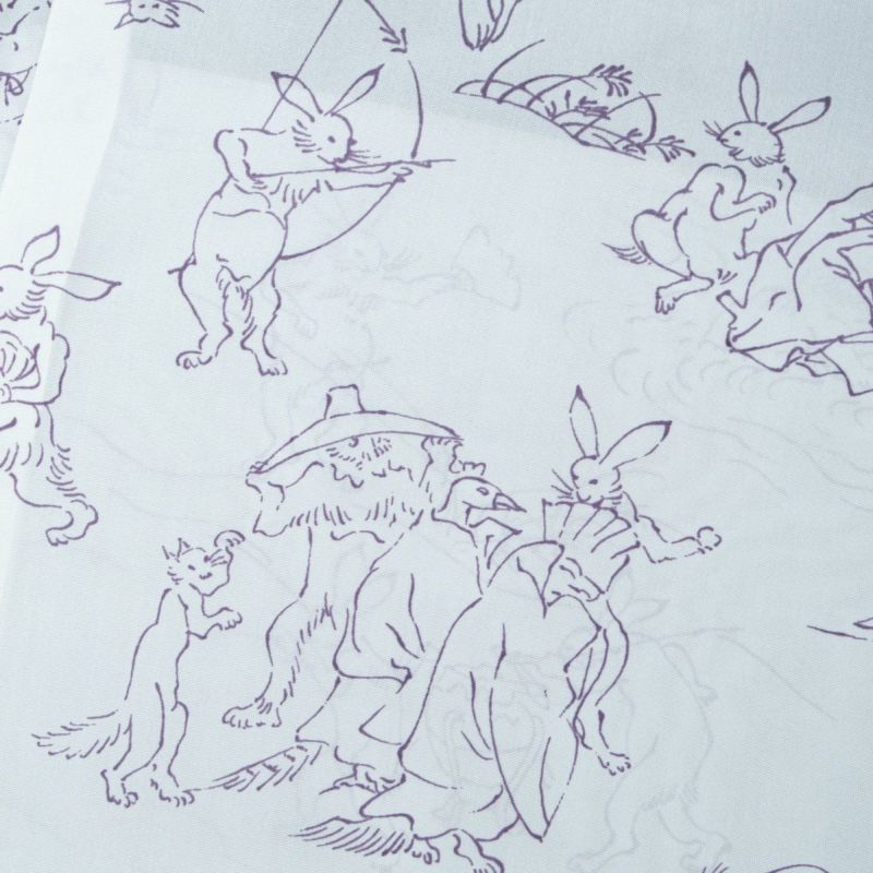 裏地には、人気の「鳥獣戯画」文様を贅沢に使用。うさぎ・狐・蛙などが遊ぶ愛らしい筆致が広がり、羽織を脱いだ際にも心が弾む粋な仕立てとなっています。