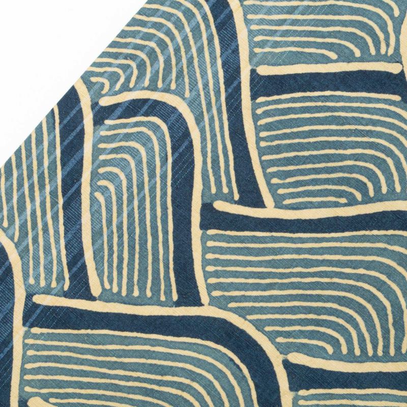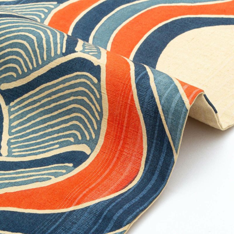 青海波を思わせるリズムのある曲線文様に、青・金赤・生成りが重なり、モダンで躍動感のある印象に仕上がっています。