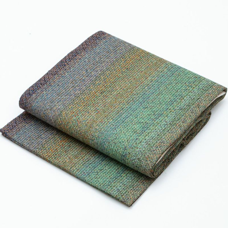 深みのあるグリーンからブルーへと流れるように変化する、美しいグラデーションが特徴の開き名古屋帯です。