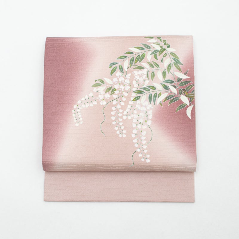 やわらかな紅藤色の地に、しなやかに垂れる藤の花を描いた、上品な趣の開き名古屋帯です。