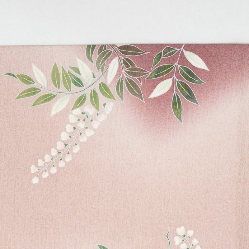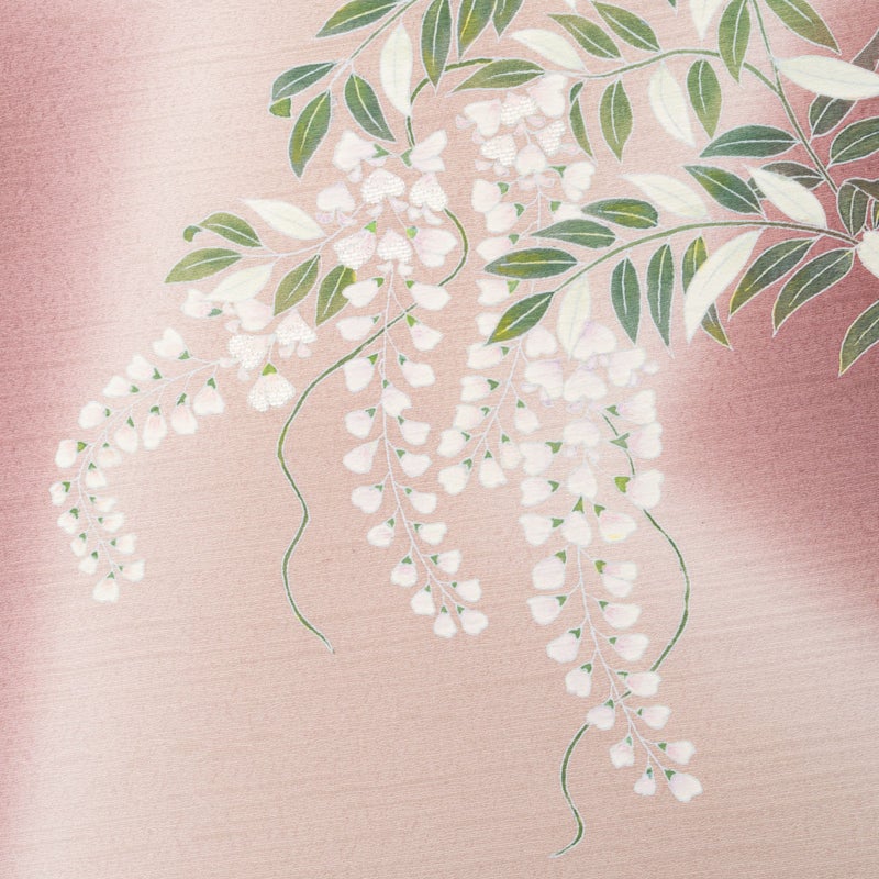 淡く揺れる花房には繊細な刺繍が施され、友禅ならではのやさしい彩りと相まって、静かな華やぎを感じさせます。
